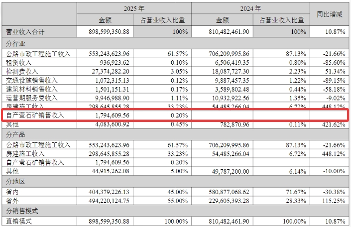 然而,作为成都路桥寄予厚望的“新利润增长点”,自产萤石矿的销售收入却如同投入一颗小石子,在全年营收的巨浪中仅激起一圈涟漪,占全年营收比重的0.2%。