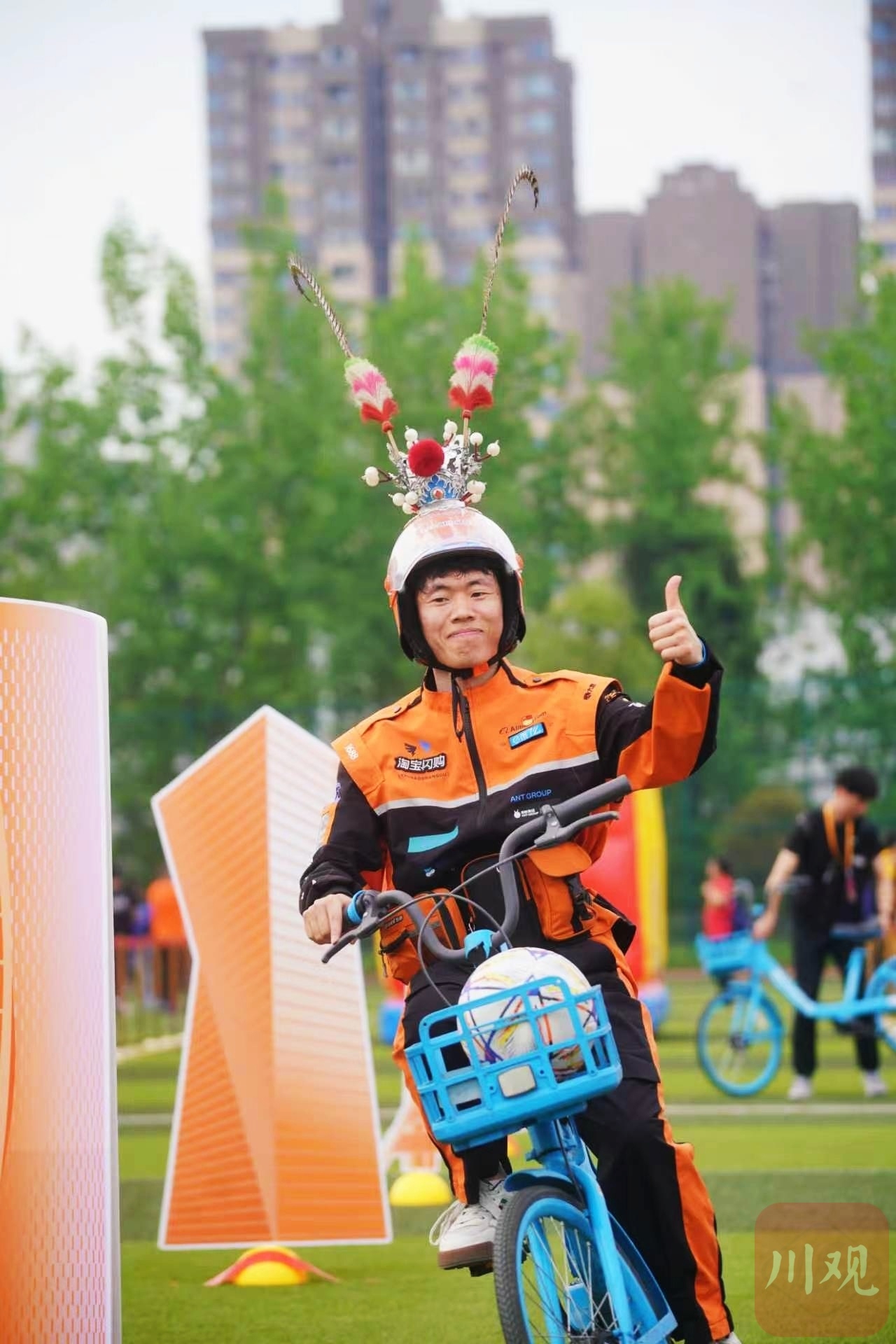 头戴创意头盔的快递小哥在骑行绕桩项目中完成挑战。