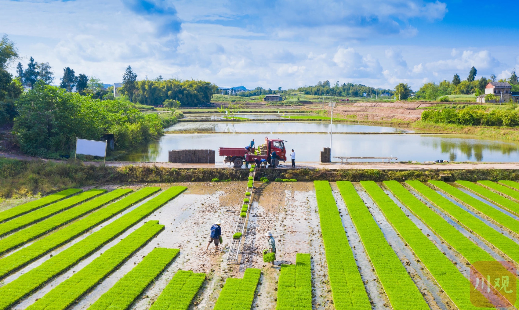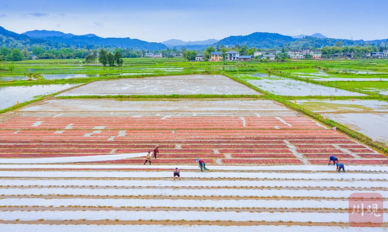 4月7日,广安市广安区花桥镇上游村田间一派繁忙,村民们正抢抓农时开展水稻育秧工作。C视觉签约摄影师 张晓