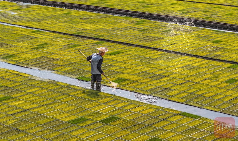 4月14日,旌阳区红光村村民对秧母田秧苗进行洒水、施叶面肥等苗期管理,助力水稻稳产、村民增收。C视觉签约摄影师 王福明