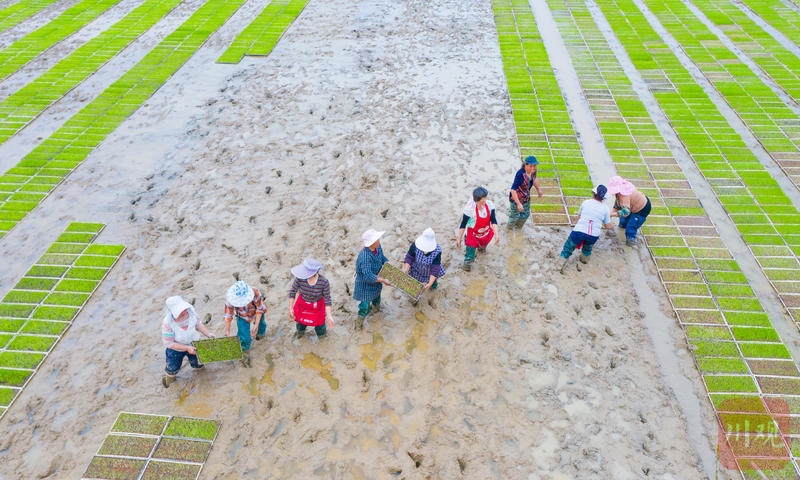 4月10日,广安市广安区花桥镇光荣村标准化育秧基地内,农民抢抓农时移栽秧苗。C视觉签约摄影师 张晓