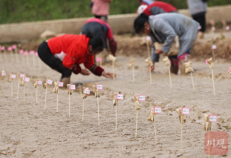 4月13日,广元市昭化区卫子镇王家贡米科研育种试验示范基地,群众播种经南繁加代育种的王家贡米新品种及育种材料。C视觉签约摄影师 唐彪