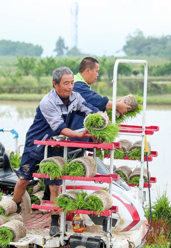 4月15日,华蓥市华龙街道东方村粮油生产基地,农民为插秧机装载秧苗。C视觉签约摄影师 邱海鹰