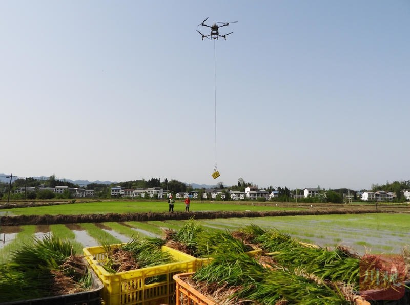 4月5日,达州市达川区万家镇迎风村邓家坝田间,无人机在进行水稻秧苗空运作业。C视觉签约摄影师 邓良奎