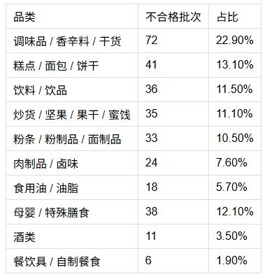 从抽检不合格品类来看,调味品、香辛料、干货是最易出现不合格的品类,达 72 批次,占比22.9%。该品类的质量隐患主要集中在二氧化硫超标、防腐剂滥用、色素超标三大方面。糕点/面包/饼干、母婴/特殊膳食、饮料/饮品紧随其后,不合格占比分别为 13.10%、12.10%、11.50%。