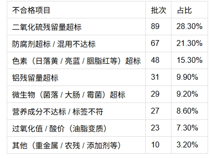 此外,抽检发现,粉条/粉制品的铝残留问题高发;糕点/面包/饼干类食品频繁出现防腐剂超标、微生物污染、色素滥用等问题;母婴及特膳食品则存在营养成分虚标、含量不达标等突出问题。