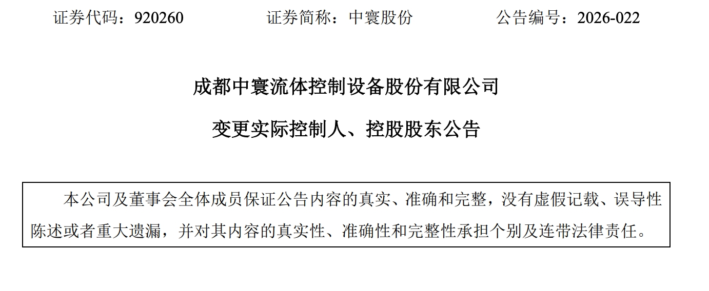 4月15日,成都中寰流体控制设备股份有限公司(下称“中寰股份”)发布公告,因原控股股东、实际控制人李瑜逝世,其持有的公司5360.14万股股份(占总股本51.76%)由罗蓉通过夫妻共同财产分配及遗产继承取得。本次变更后,罗蓉成为公司控股股东、实际控制人,其女李青、女婿张迪作为一致行动人,持股不变。