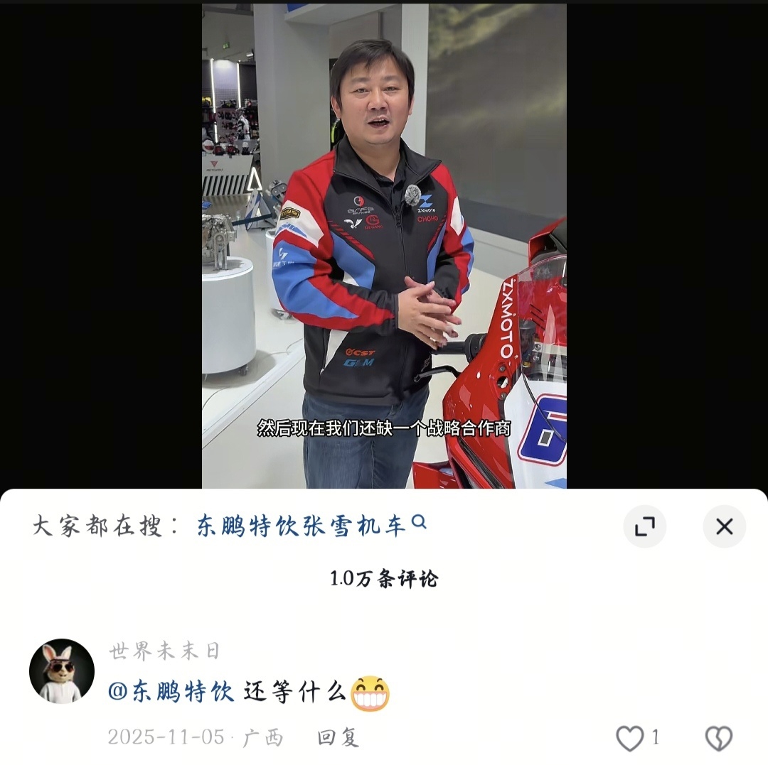 这本是一条常规的“招商公告”。没想到,评论区画风突变——大批机车迷开始疯狂@东鹏特饮官方账号,有人喊“东鹏,快上”,有人写“东鹏走向世界啦,还在等什么”,还有人把东鹏的瓶身P到了张雪机车的赛道上。网友的“拉郎配”,就这样轰轰烈烈地开始了。