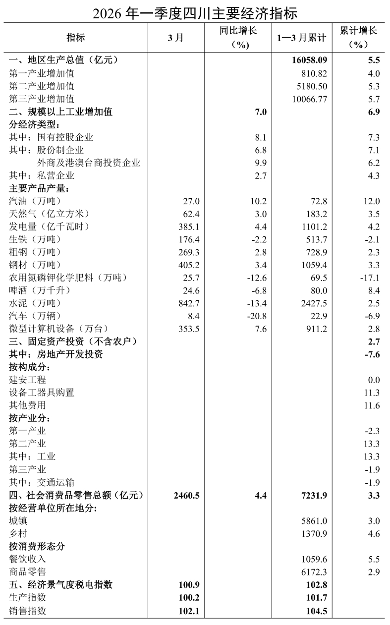 4月17日,省政府新闻办召开新闻发布会,介绍2026年一季度四川经济形势。四川省统计局副局长、新闻发言人杨治刚介绍,一季度全省主要经济指标增速稳步回升,经济实现良好开局。根据地区生产总值统一核算结果,2026年一季度四川地区生产总值(GDP)为16058.09亿元,按不变价格计算,同比增长5.5%。