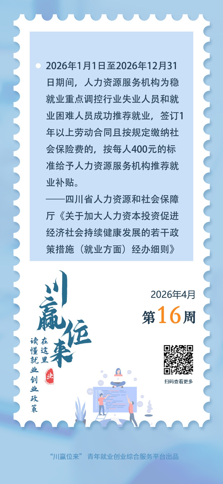 四川省人力资源和社会保障厅近日印发《关于加大人力资本投资促进经济社会持续健康发展的若干政策措施(就业方面)经办细则》,明确提出“2026年1月1日至2026年12月31日期间,人力资源服务机构为稳就业重点调控行业失业人员和就业困难人员成功推荐就业,签订1年以上劳动合同且按规定缴纳社会保险费的,按每人400元的标准给予人力资源服务机构推荐就业补贴。”