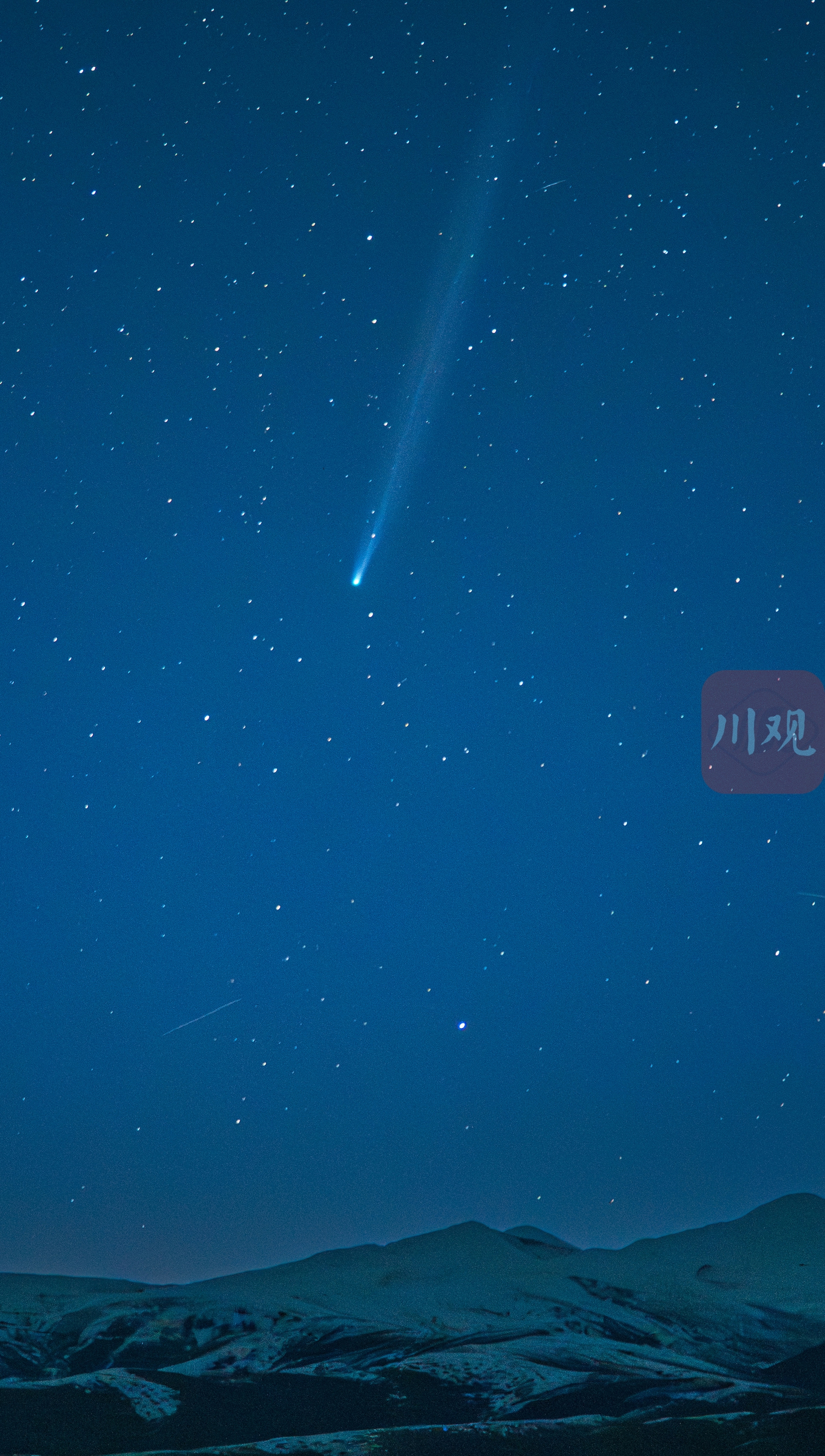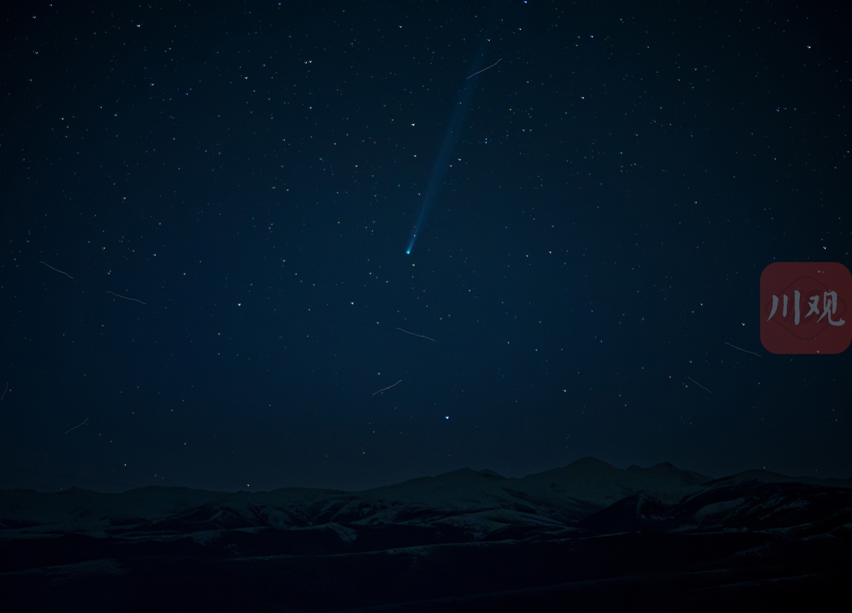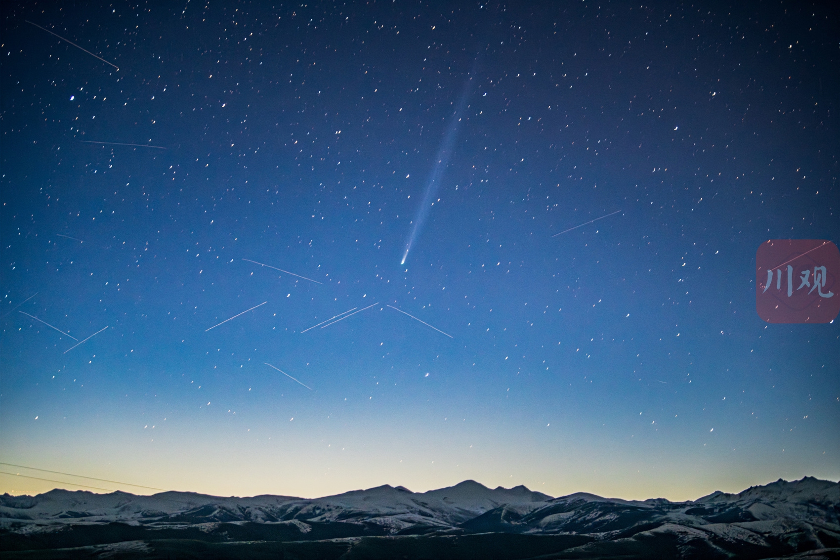 彗星拖着长长的慧尾出现雪山上空。