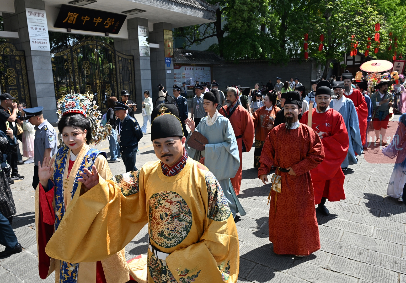 2026年4月18日,汉服巡游队伍行走在四川阆中古城,吸引众多游客前来观看。