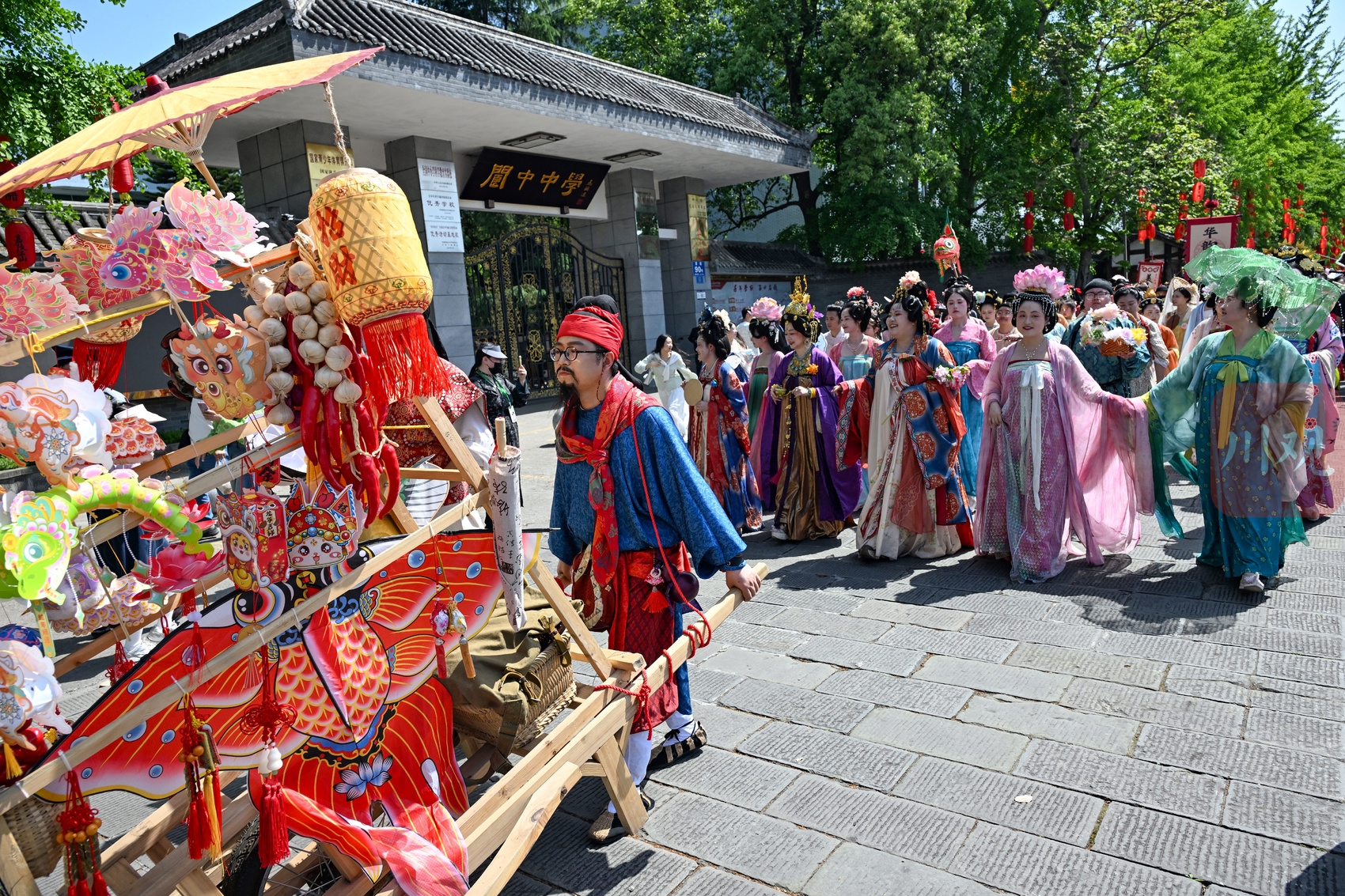 2026年4月18日,汉服巡游队伍行走在四川阆中古城。