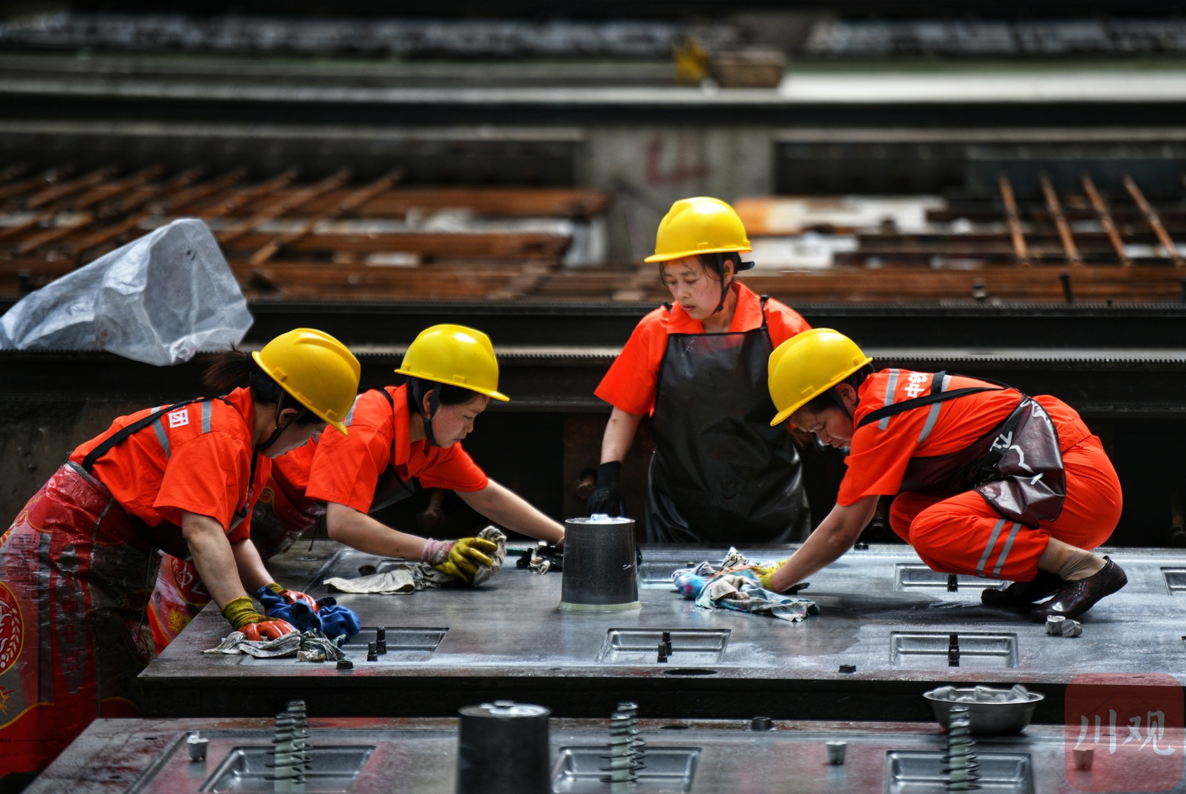 制板厂单日最高产能达128块,较传统工艺效率提升超20%,生产合格率始终保持100%。“每块轨道板均需经60余项严格检测方可出厂,为后续无砟轨道施工提供坚实保障。”中铁十一局成渝中线高铁安岳制板厂总工程师罗志强说。