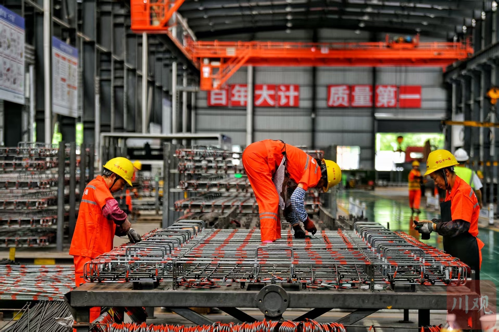 这双“铁板鞋”的核心就是预制轨道板。成渝中线高铁安岳制板厂,负责乐至至重庆段的轨道板生产。4月17日,记者走进厂区,工人正为最后一批轨道板忙碌着:先绑扎钢筋笼,搭起轨道板的“筋骨”;再施加预应力,给“筋骨”上劲儿;然后浇筑混凝土,等待成型。大约20小时,就能完成一次生产循环,一批轨道板“新鲜出炉”。