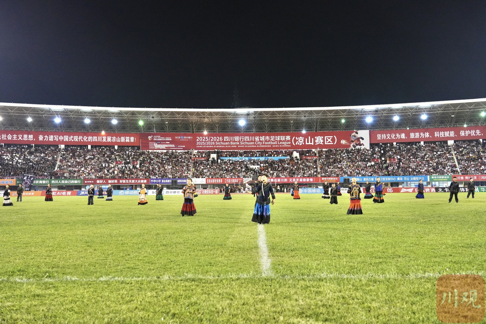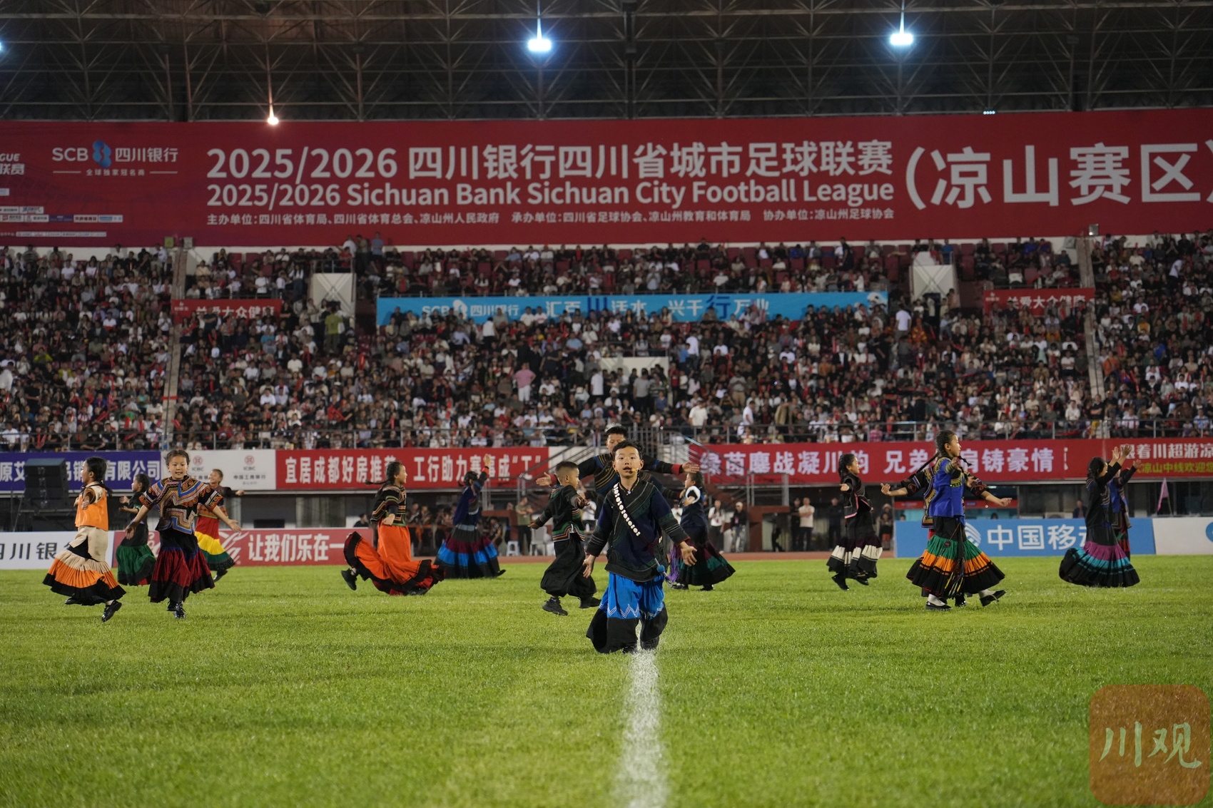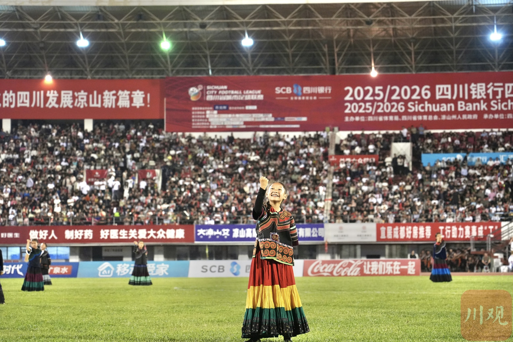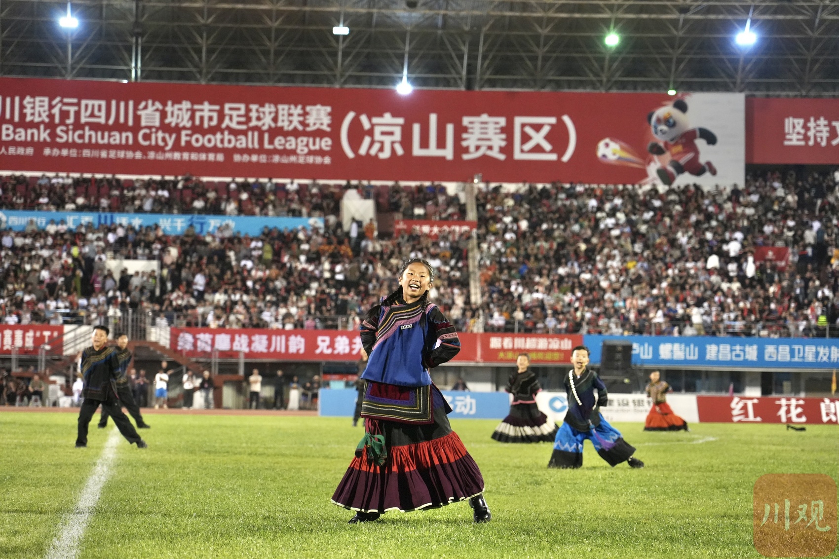 4月18日晚,“川超”决赛阶段第六轮举行,在凉山民族体育场,凉山好医生队对阵成都锦城队。中场休息时,一阵阵悦耳的童声从现场传来,是凉山州喜德县的果果合唱团带来的歌曲《勇敢的少年》。