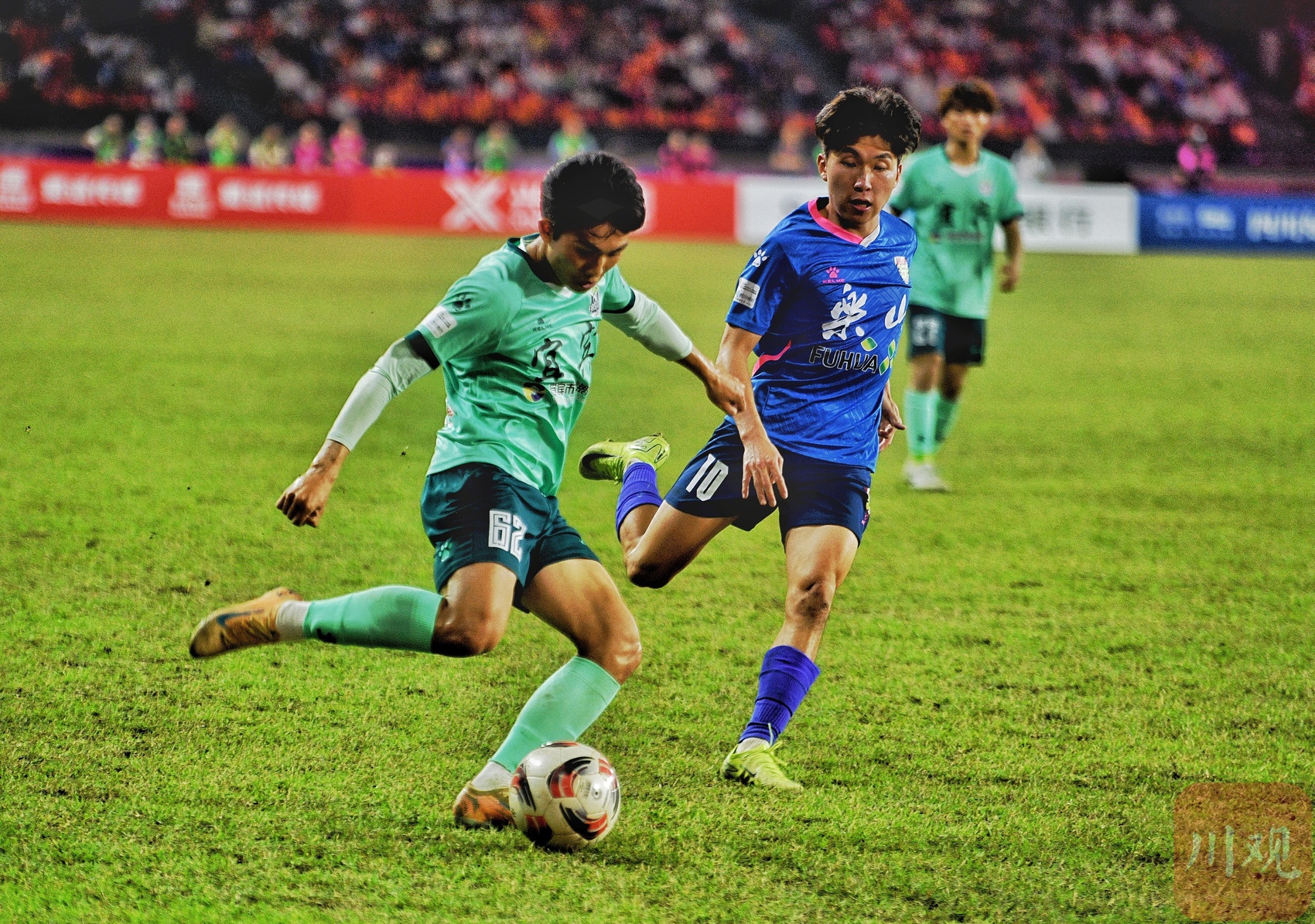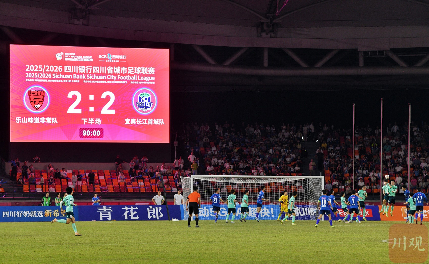 加时赛阶段,场上拼抢进入白热化,宜宾队78号邓以珩主罚角球时踢出一记“神仙球”,皮球直接旋入球门,将比分顽强扳为2比2。