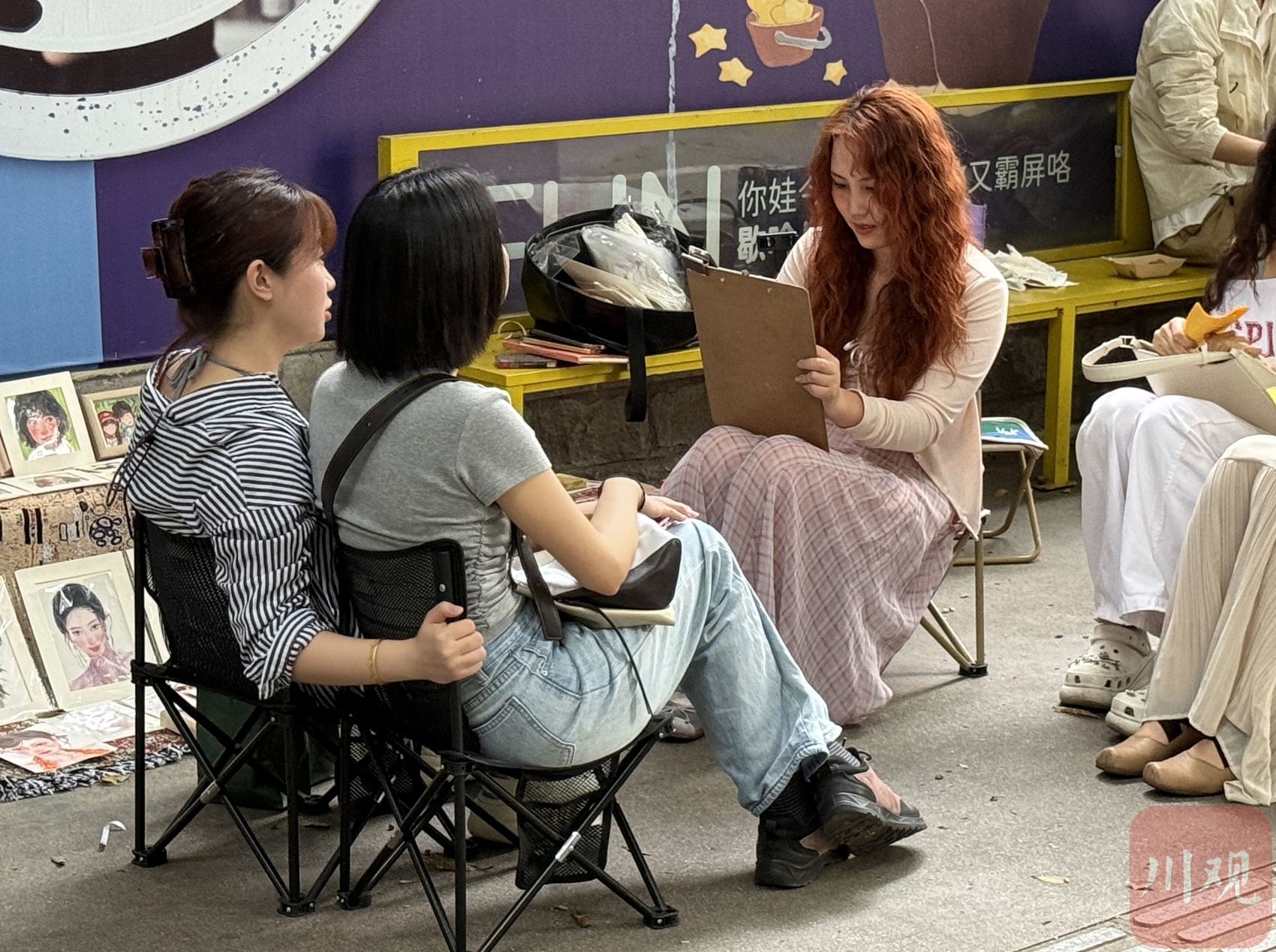 4月19日,周末的成都芳华街人流渐渐密集起来。有人喝咖啡、有人逛店,也有人在街边坐下,等着画师把自己画成一张“漫画脸”。