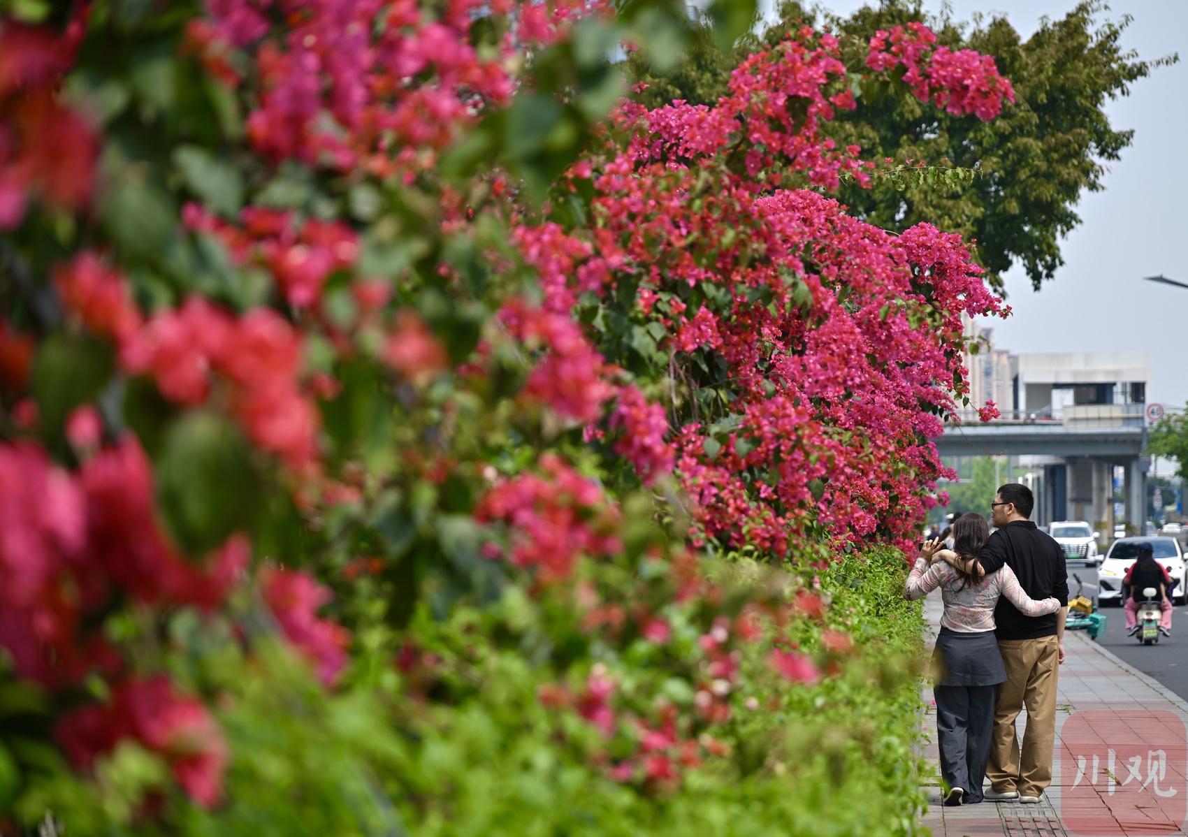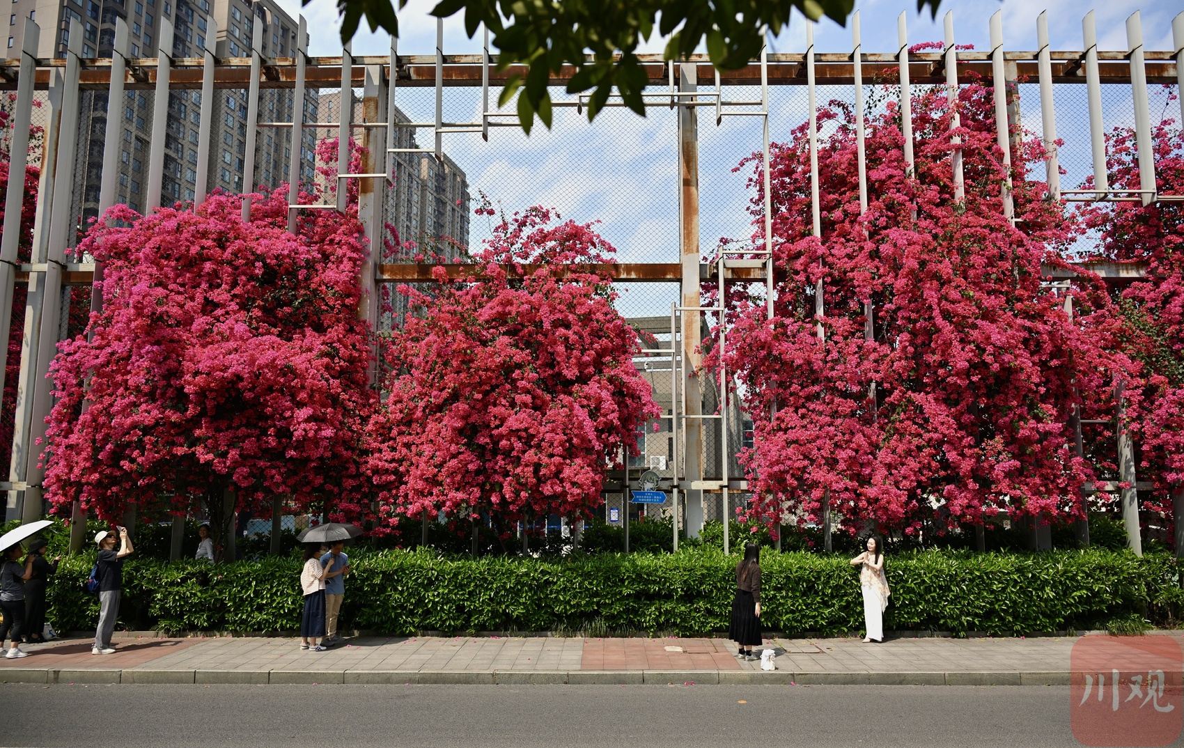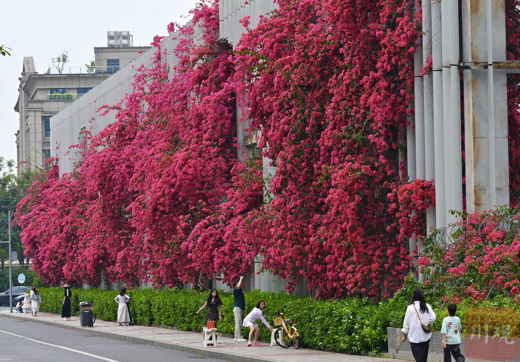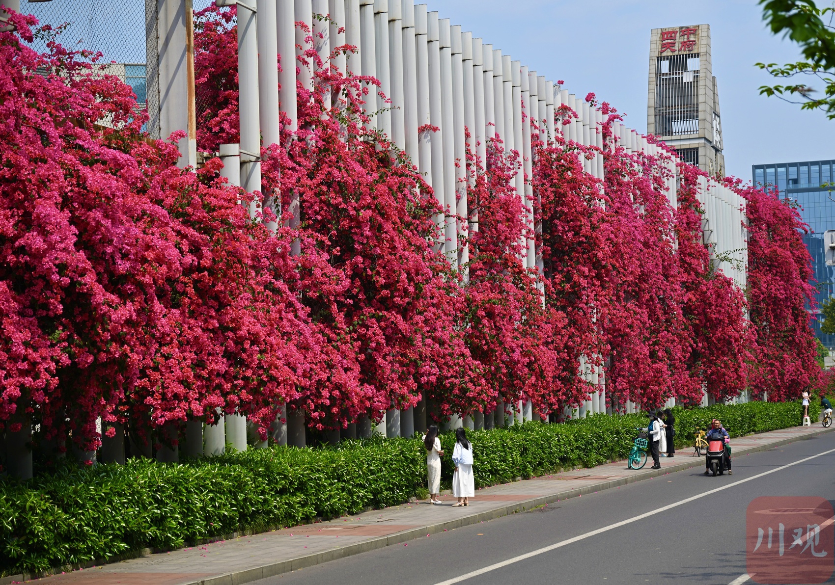 4 月 19 日,成都剑南大道北段、石室天府中学交子校区旁,三角梅迎来盛放期。花枝从围墙顶端倾泻而下,绵延成片,像一道玫红色花瀑垂到路边,热烈又浪漫。