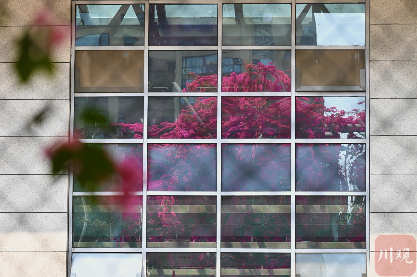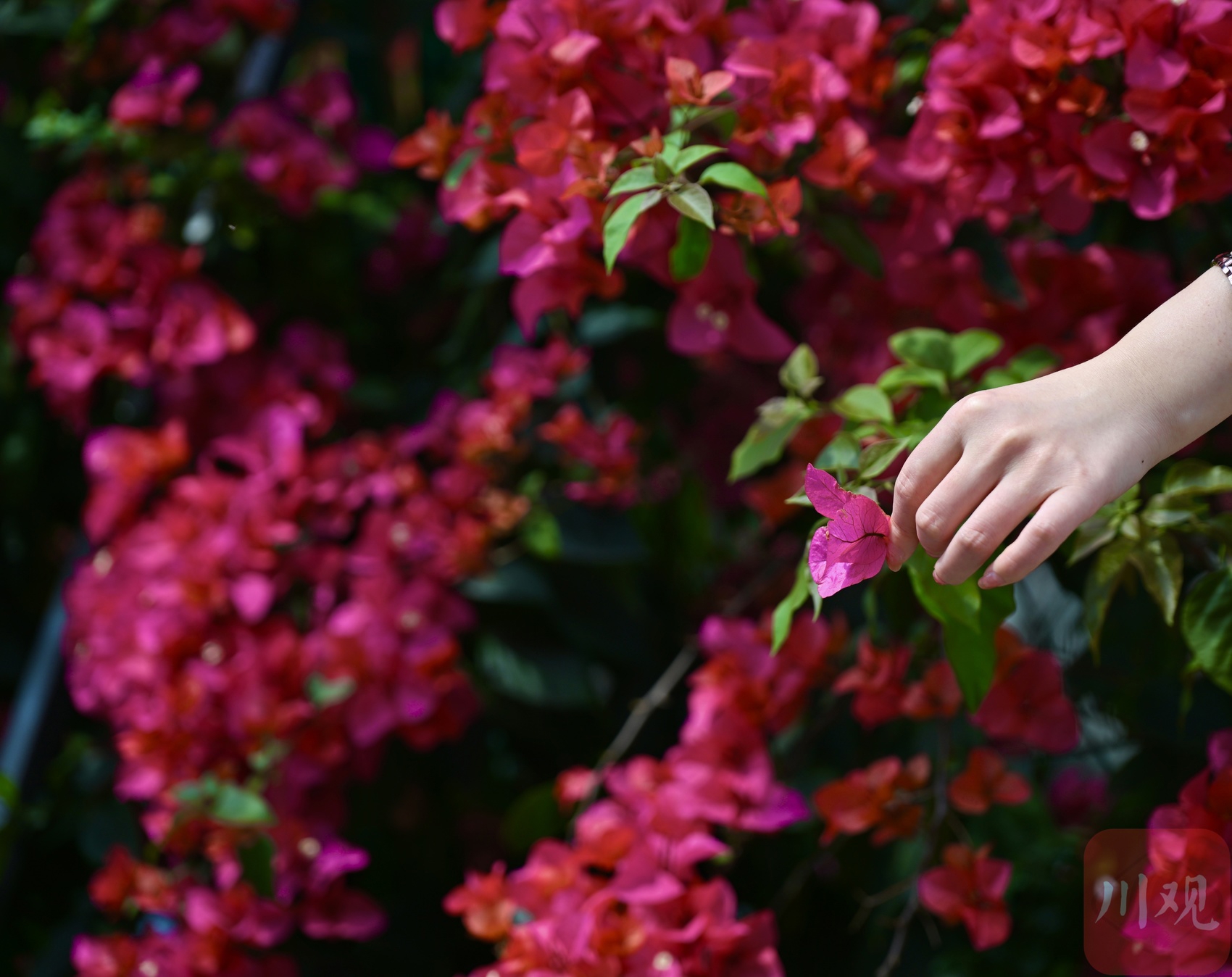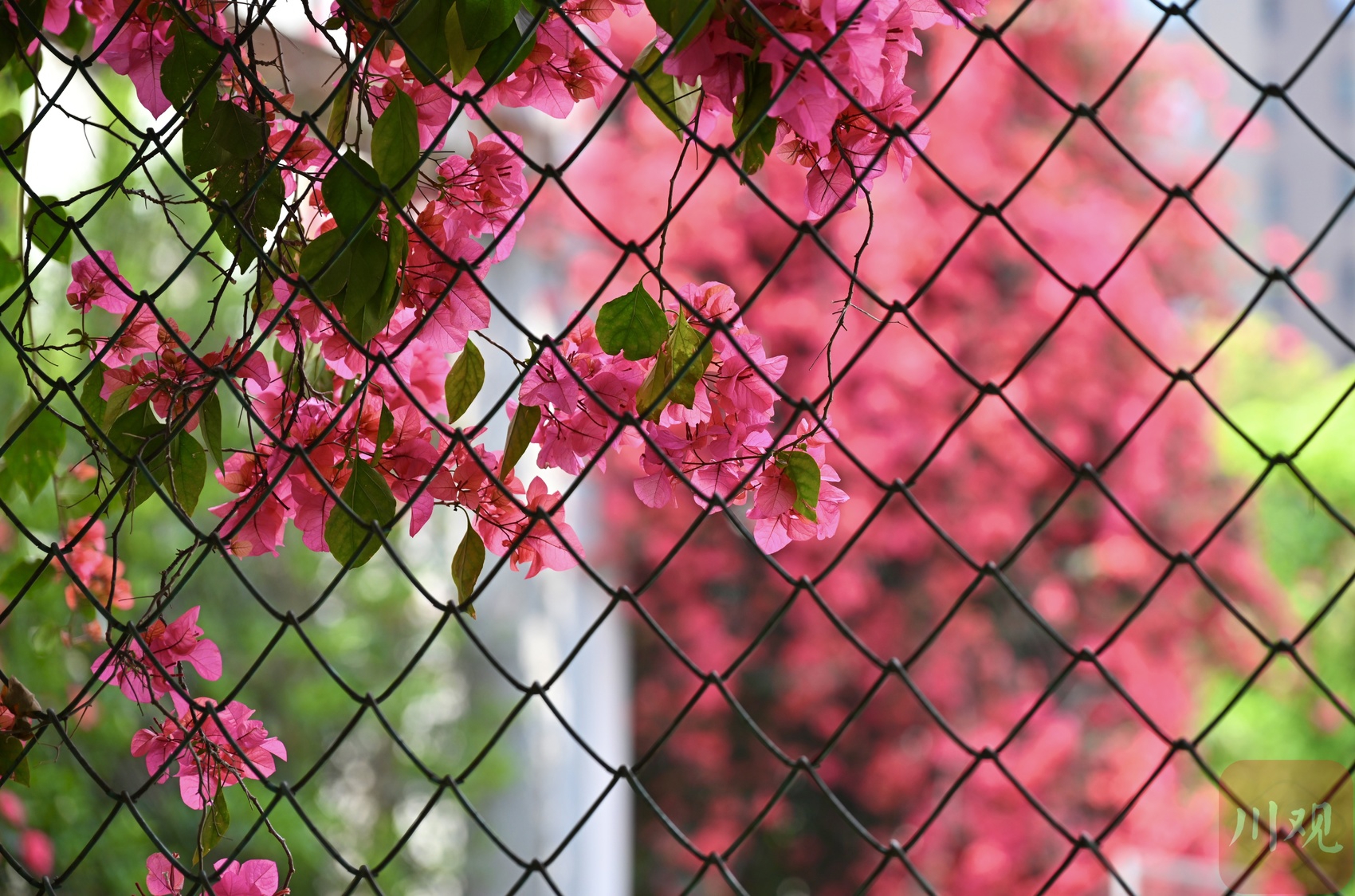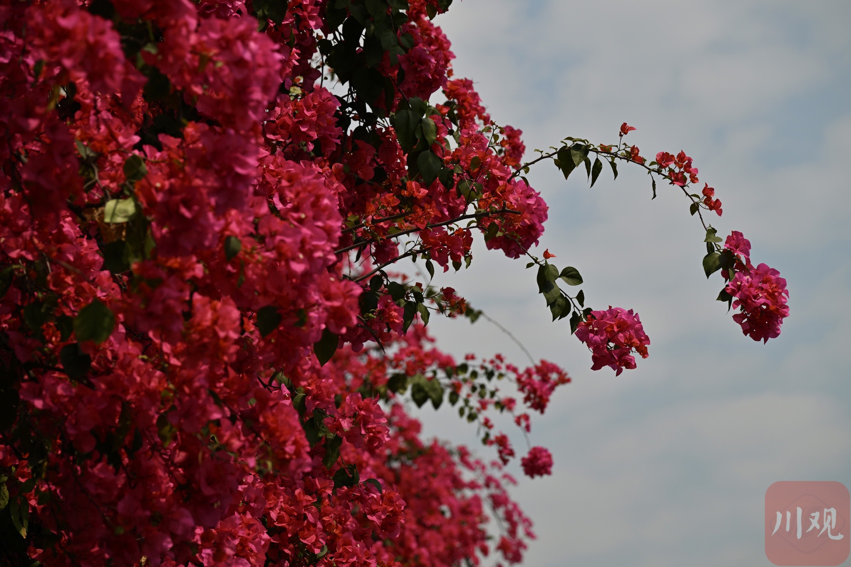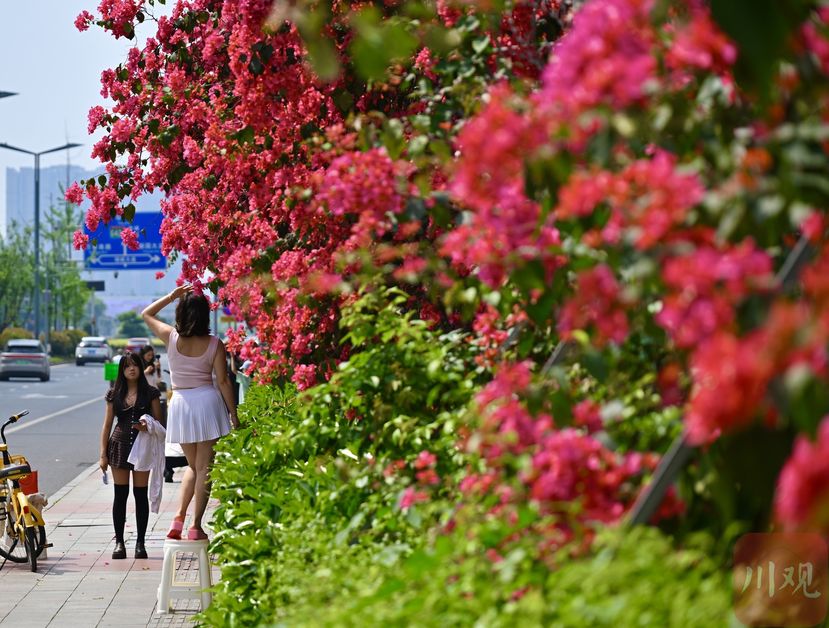 4 月 19 日,成都剑南大道北段、石室天府中学交子校区旁,三角梅迎来盛放期。花枝从围墙顶端倾泻而下,绵延成片,像一道玫红色花瀑垂到路边,热烈又浪漫。