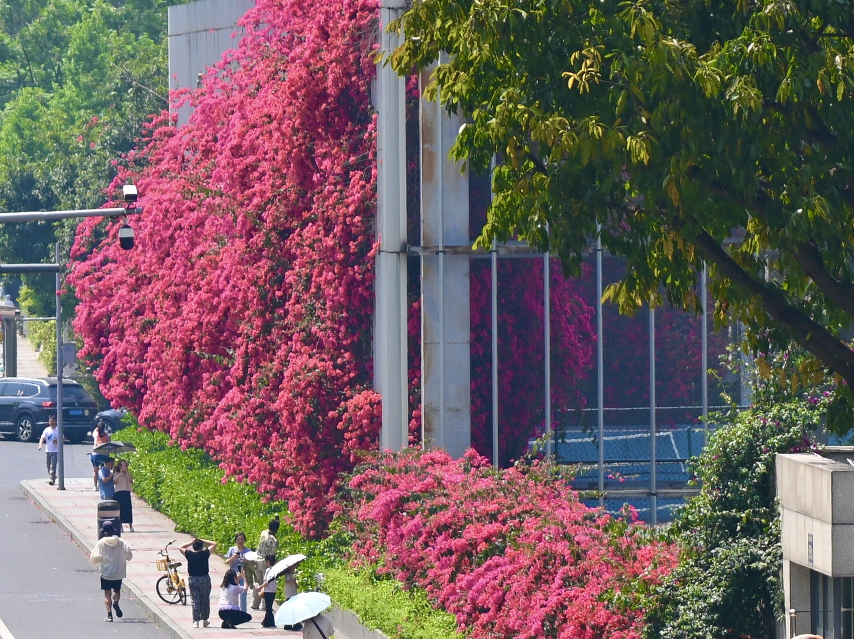 三角梅花瀑吸引路人打卡拍照。