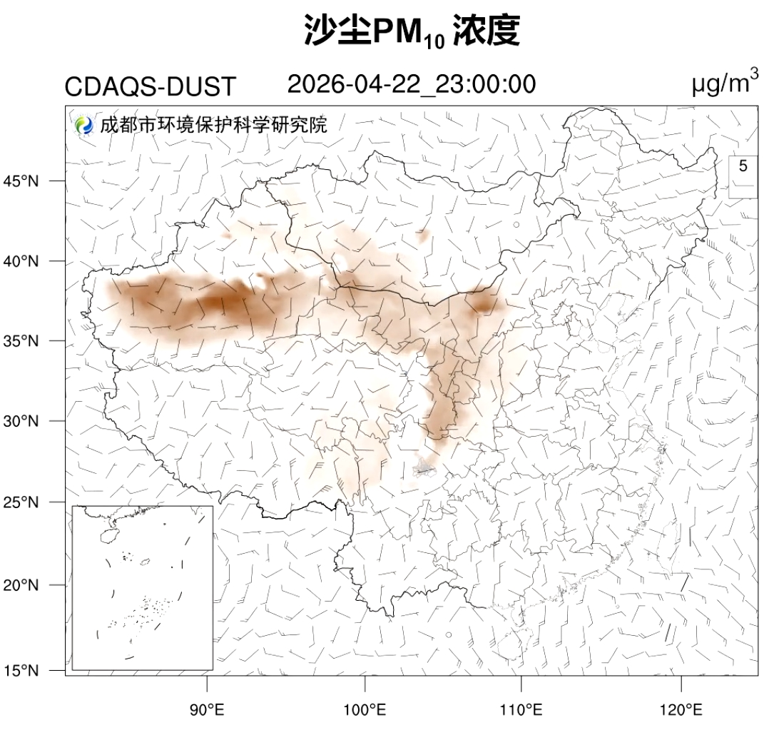 根据成都市环境保护科学研究院最新监测与预报,成都市自4月19日20时起受到明显影响,PM10浓度在3小时内自良达中度、再达严重污染。预计本次沙尘影响将持续至22日前后。