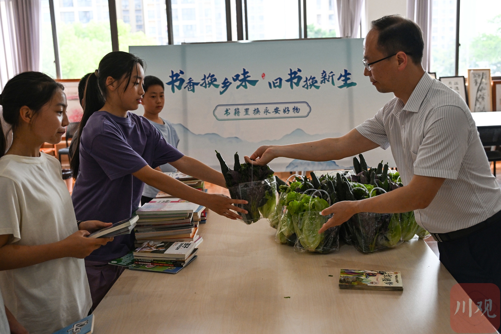 2026年4月19日,在四川省成都市双流区永安镇葆琛乐育书院,小学生利用旧书籍兑换当地新鲜蔬菜。