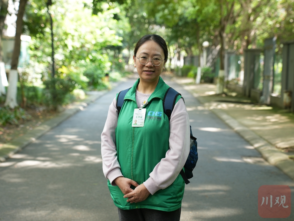 “差不多20斤,装着各种服务工具。”每天清晨,43岁的她背着这只包,骑上电瓶车,穿行在成都市新都区的大街小巷。