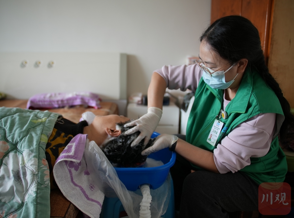 不仅辛苦,还可能受伤。有一次,张雪莲的一位同事去金堂的一个村里上门护理。头天下过雨,路很滑。在一个拐弯处,同事连人带车翻进鱼塘。还好附近有人听到呼救,及时将她救了上来。张雪莲也受过伤。那会儿她还是学徒,当时服务的失能患者患有精神疾病,师傅要给患者剪指甲时,患者不配合,抬手将张雪莲额头抓破了。