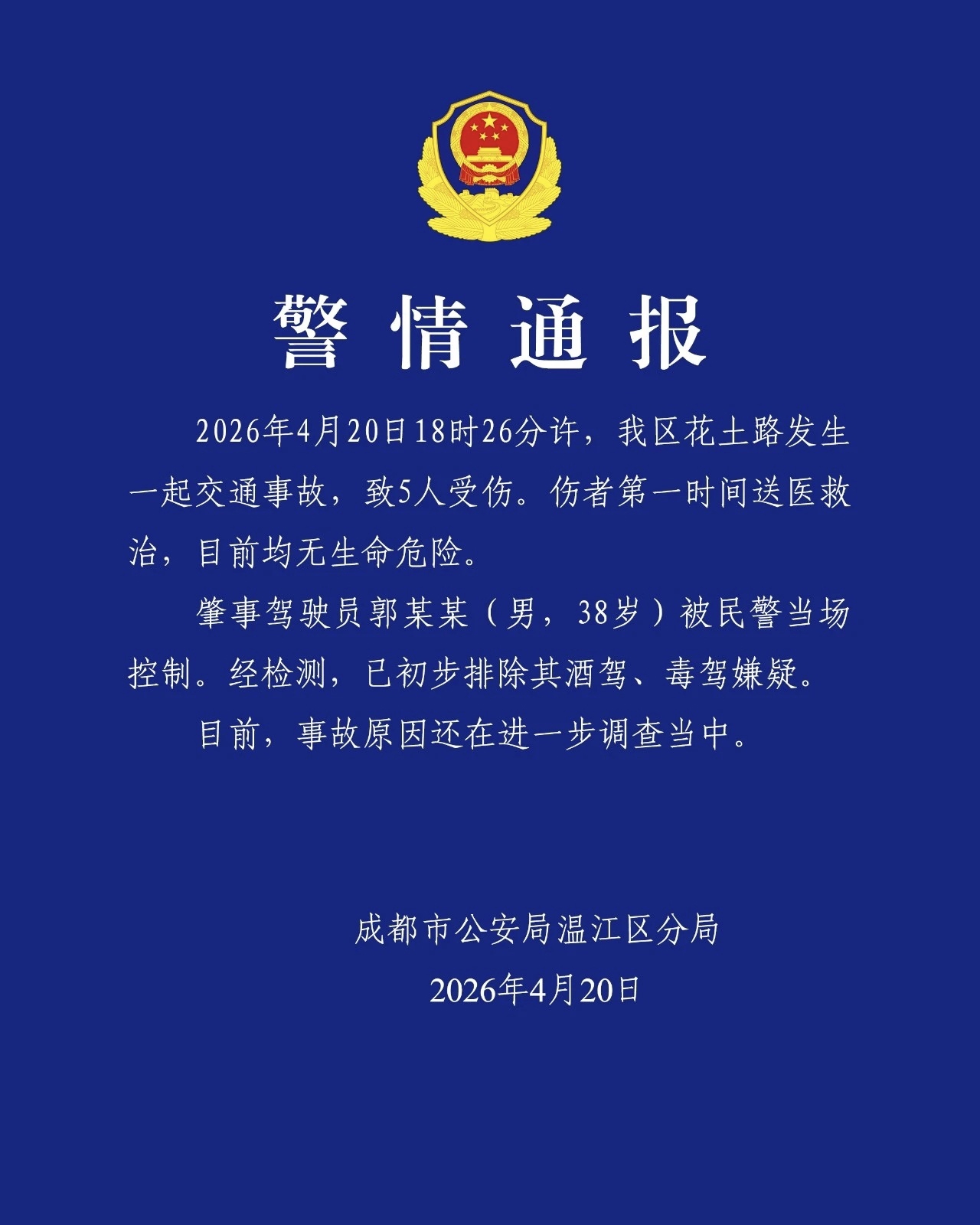 4月20日,成都市公安局温江区分局发布警情通报:当日18时26分许,温江区花土路发生一起交通事故,致5人受伤。伤者第一时间送医救治,目前均无生命危险。