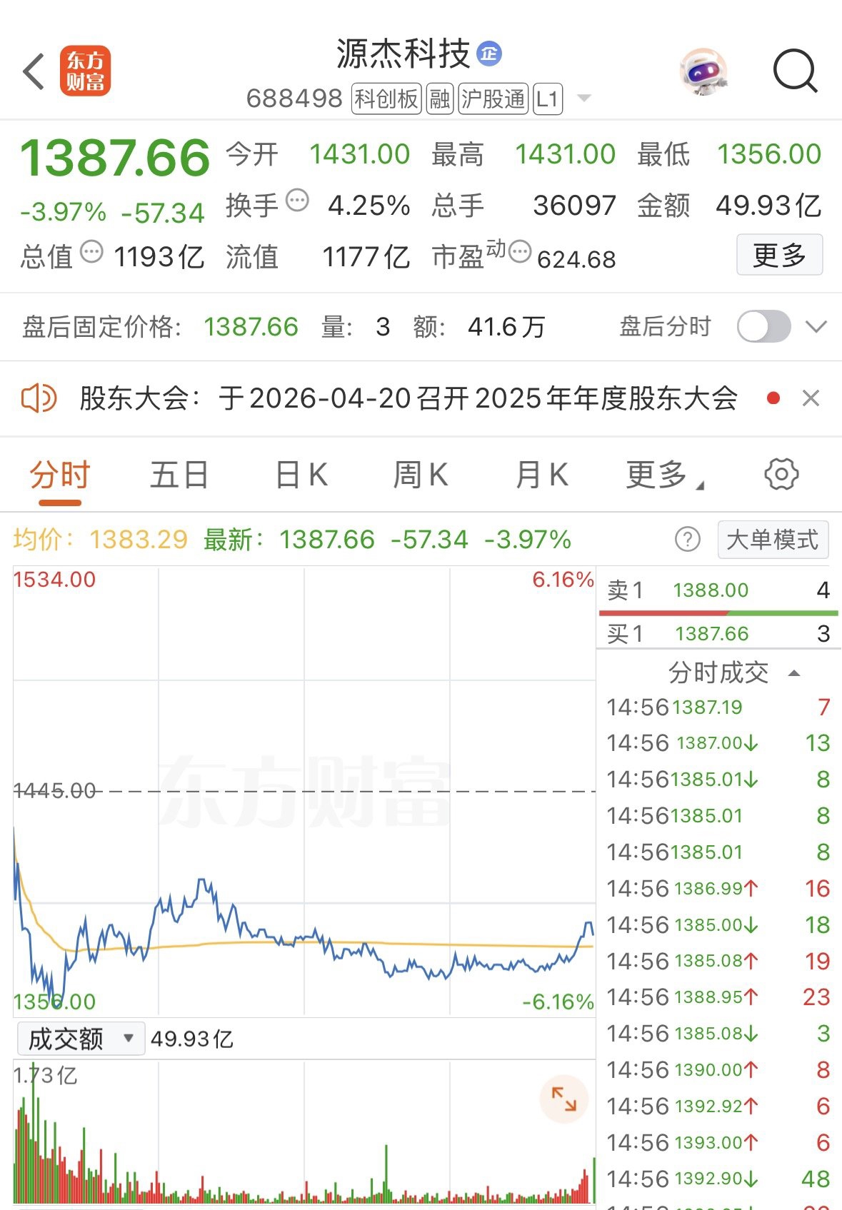 4月20日,上周一度登顶A股“股王”的源杰科技,全天在平盘线下方弱势震荡,收盘价定格在1387.66元,刚焐热的股价王座没能坐稳,迅速易主。另一边,贵州茅台收报1410.89元/股,顺势重回“股王”宝座。