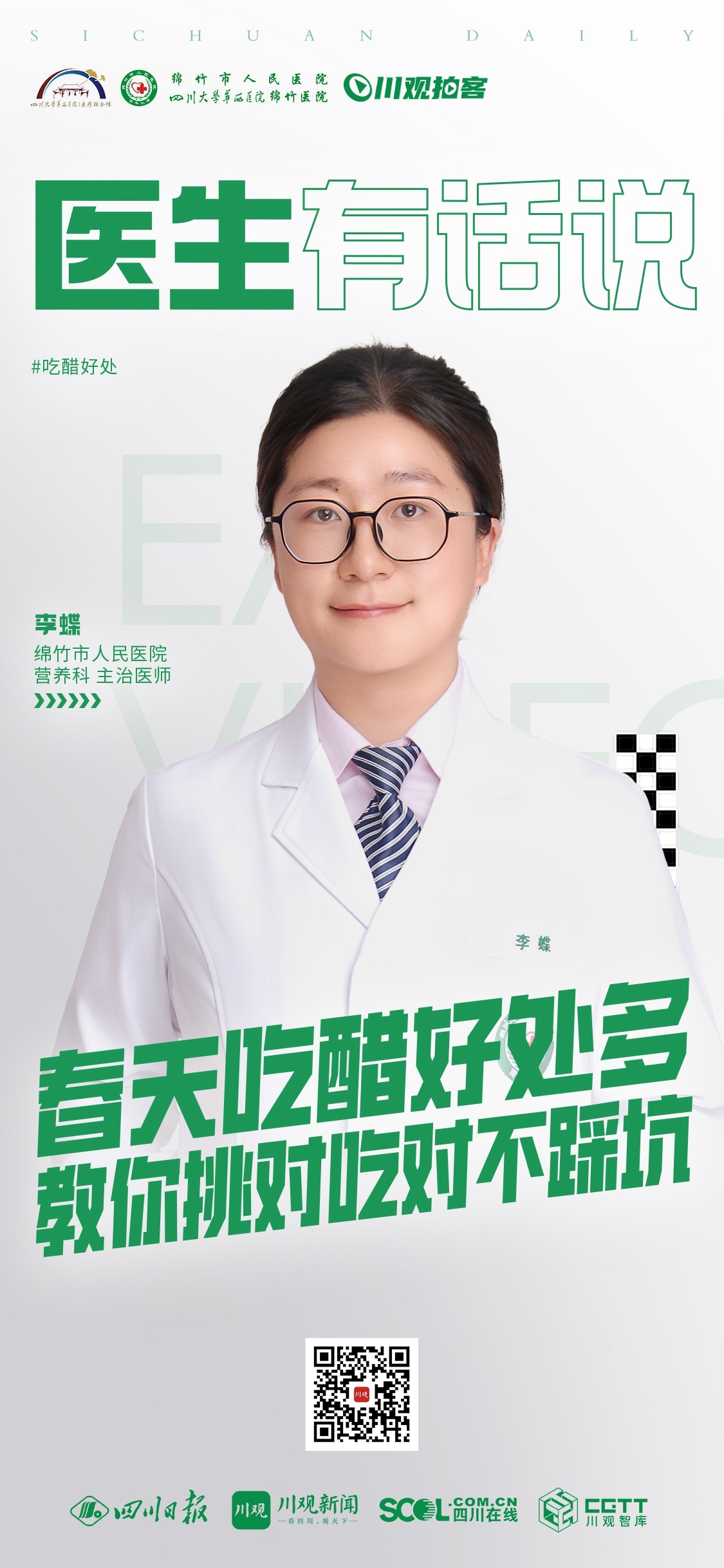 本期栏目,来自绵竹市人民医院营养科的主治医师李蝶,跟大家说一说为什么春天要多吃醋,如何正确挑选及食用。