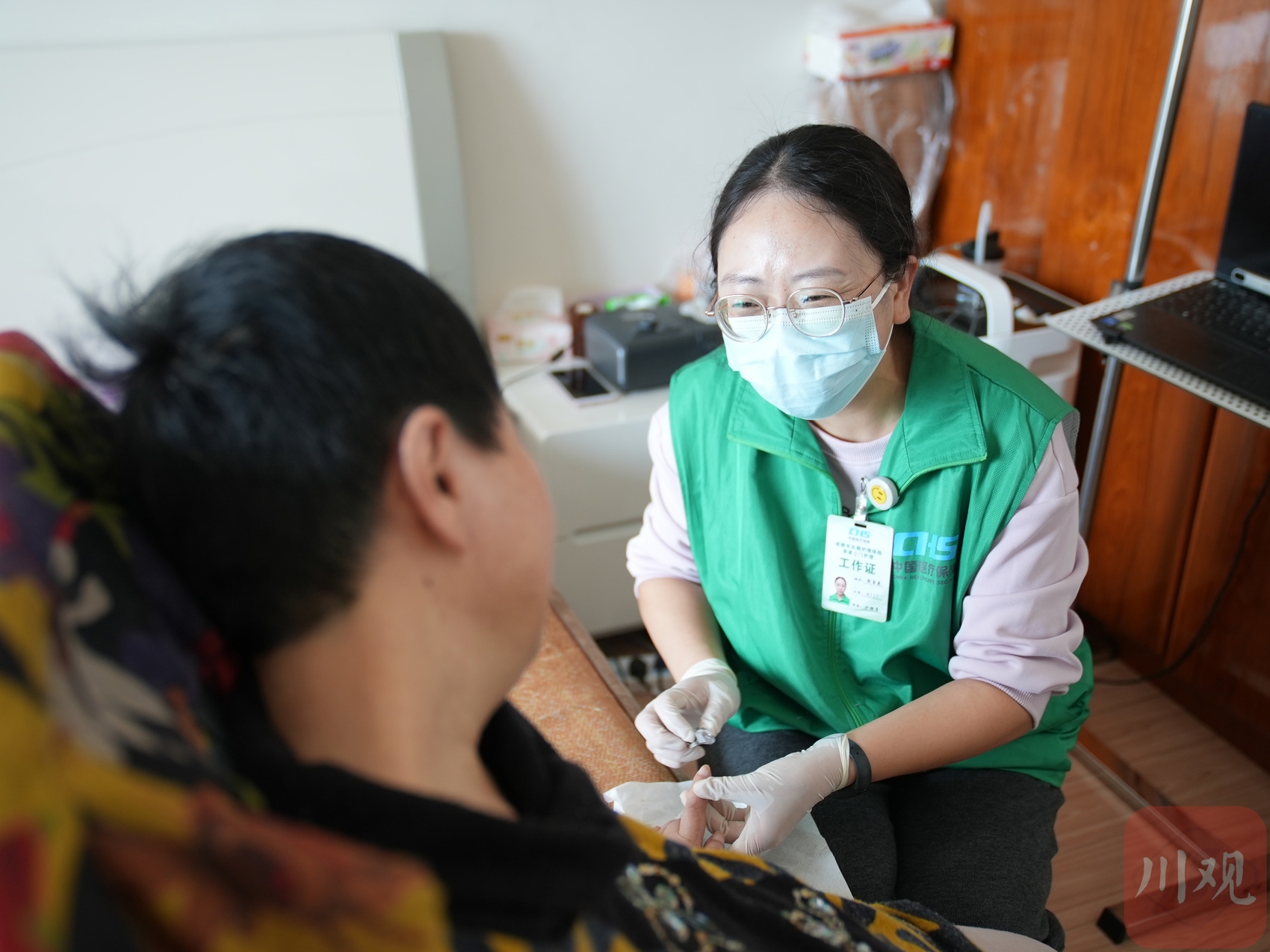 43岁的张雪莲就是其中一员。从业的近5年时间里,她背着一个20来斤重的双肩包,骑着电瓶车穿梭在成都市新都区的大街小巷,敲门走进了500多个失能患者家庭,提供了9000多次上门护理服务。