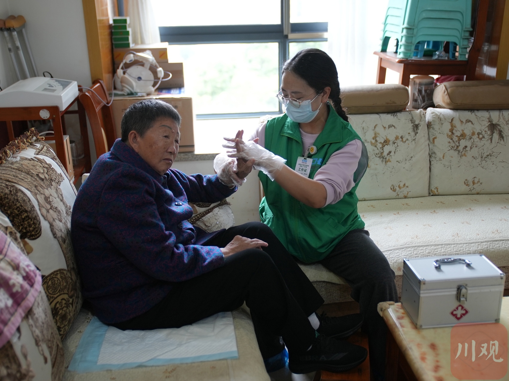 这个沉甸甸的背包,不仅装着各种为老人提供服务的工具,更装着失能患者和家属对她的信任。