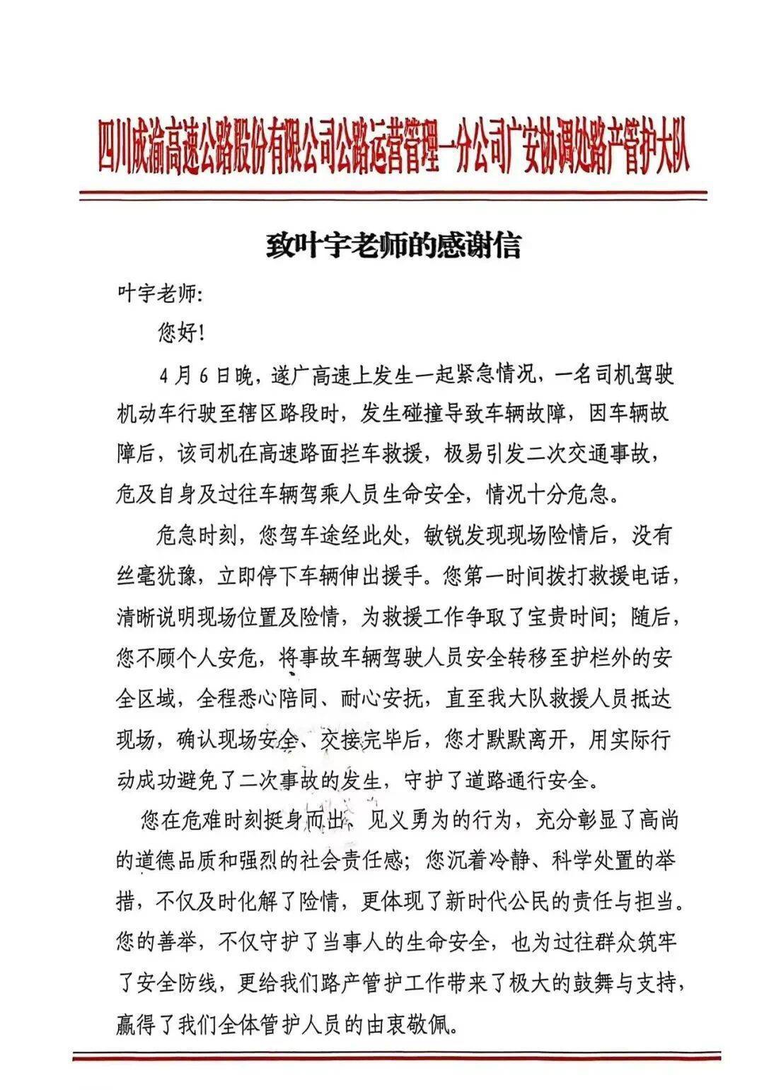 记者注意到,信中写到,叶宇在危难时刻挺身而出,见义勇为的行为,充分彰显了高尚的道德品质和强烈的社会责任感,“您沉着冷静、科学处置的举措,不仅及时化解了险情,更体现了新时代公民的责任与担当。您的善举,不仅守护了当事人的生命安全,也为过往群众筑牢了安全防线,更给我们路产管护工作带来了极大的鼓舞与支持,赢得了我们全体管护人员的由衷敬佩。”