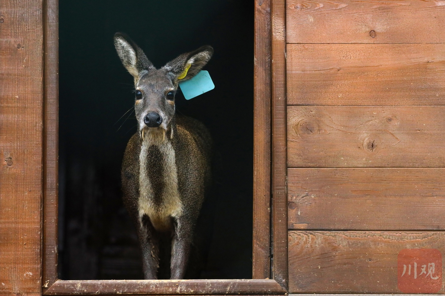 林麝好奇地从小木屋探出头。