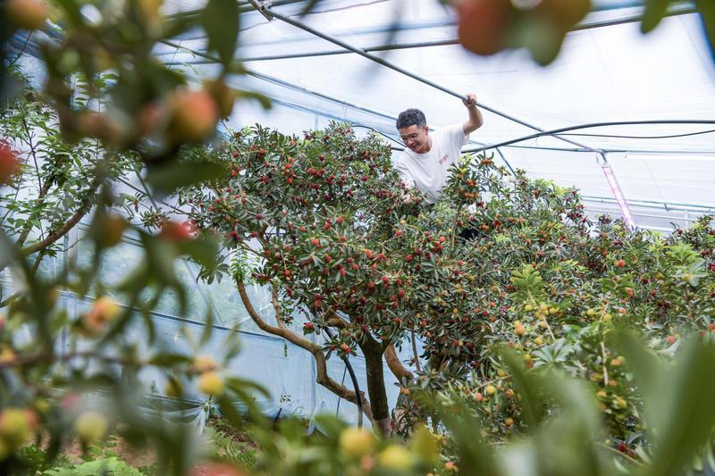 4月21日,慈溪市匡堰镇戚源杨梅专业合作社的负责人在双膜大棚内查看杨梅的成熟度。