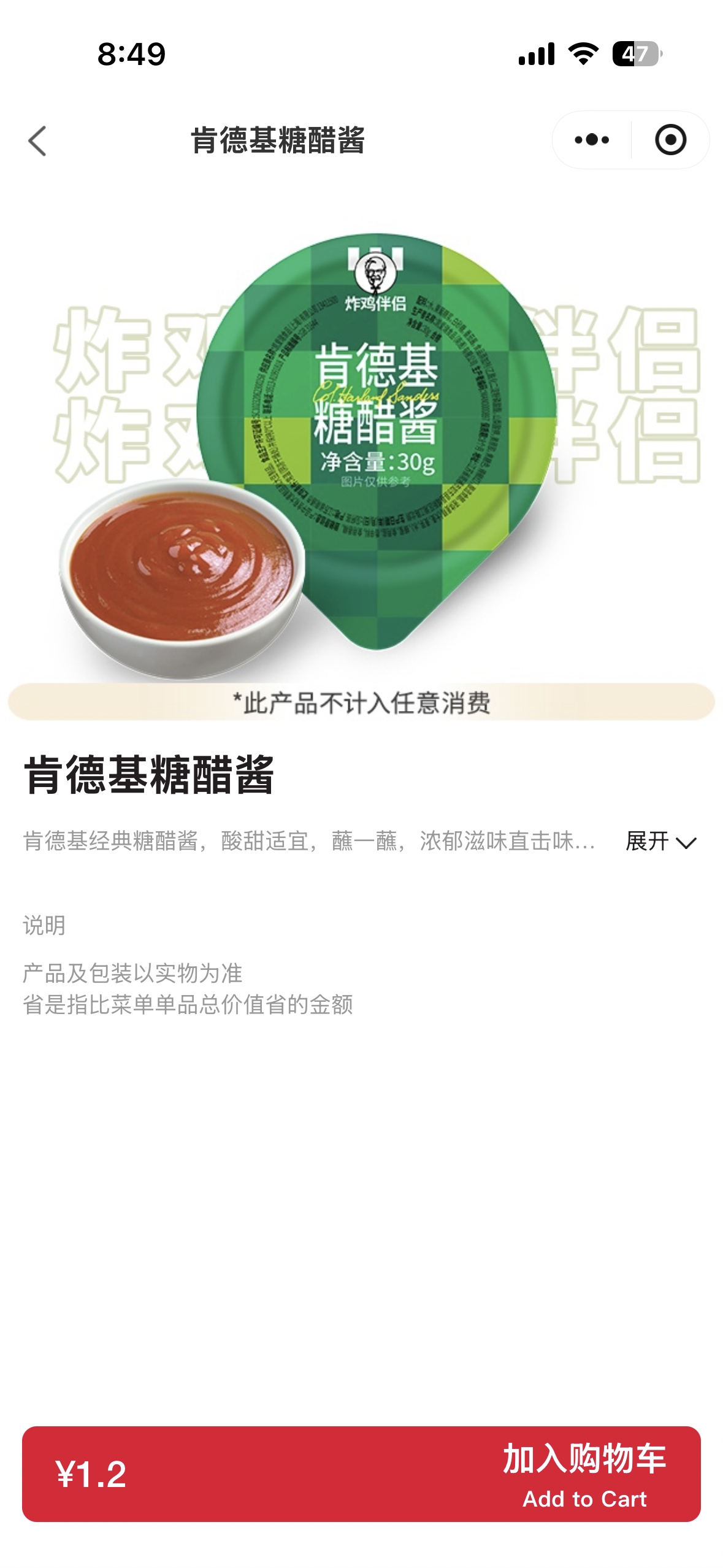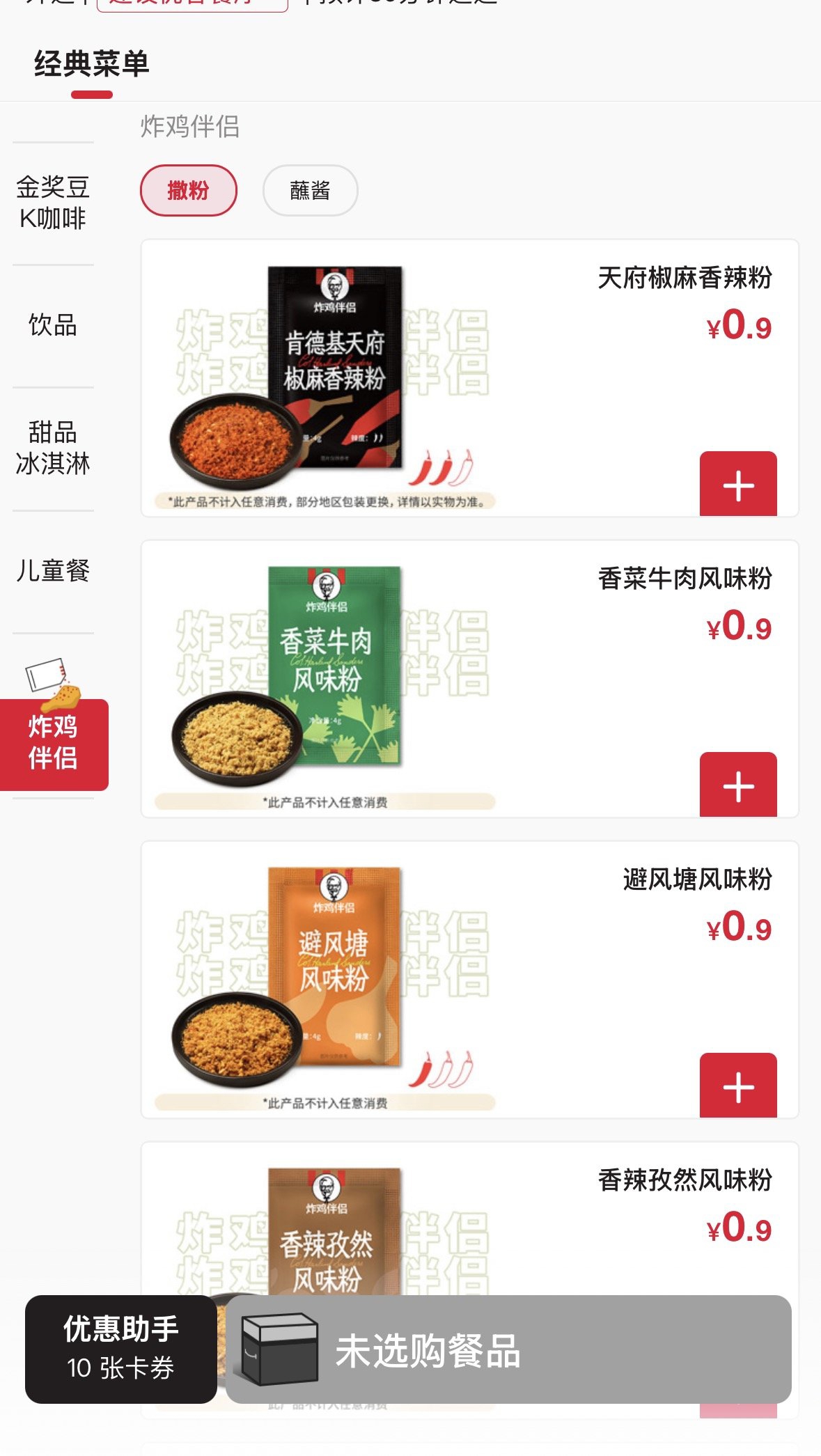 记者通过肯德基点餐小程序查询发现,目前收费酱料主要分两类:一类为撒粉产品,售价0.9元/包,包括天府椒麻香辣粉、香辣孜然风味粉、避风塘风味粉等;另一类为蘸料产品,售价1.2元/个,涵盖糖醋酱、甜辣酱及肯德基炸鸡专用酱。