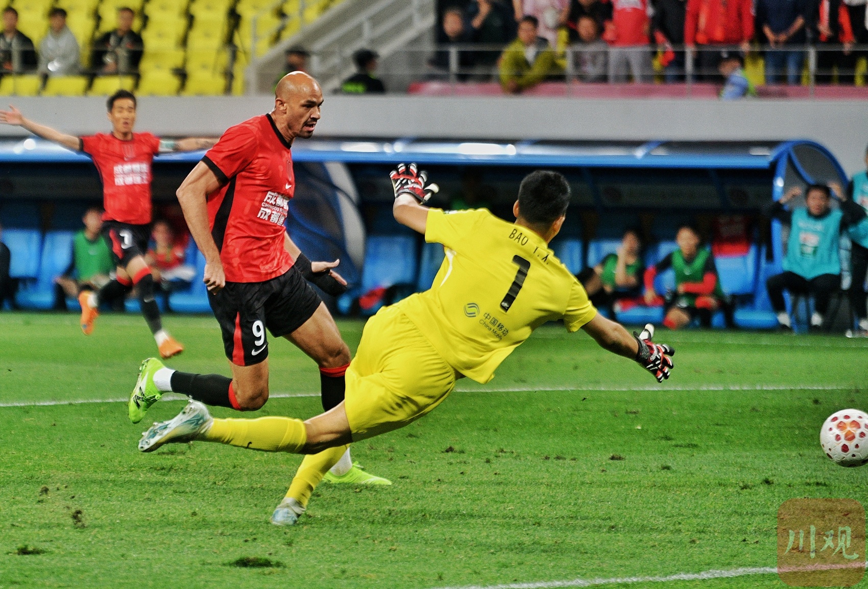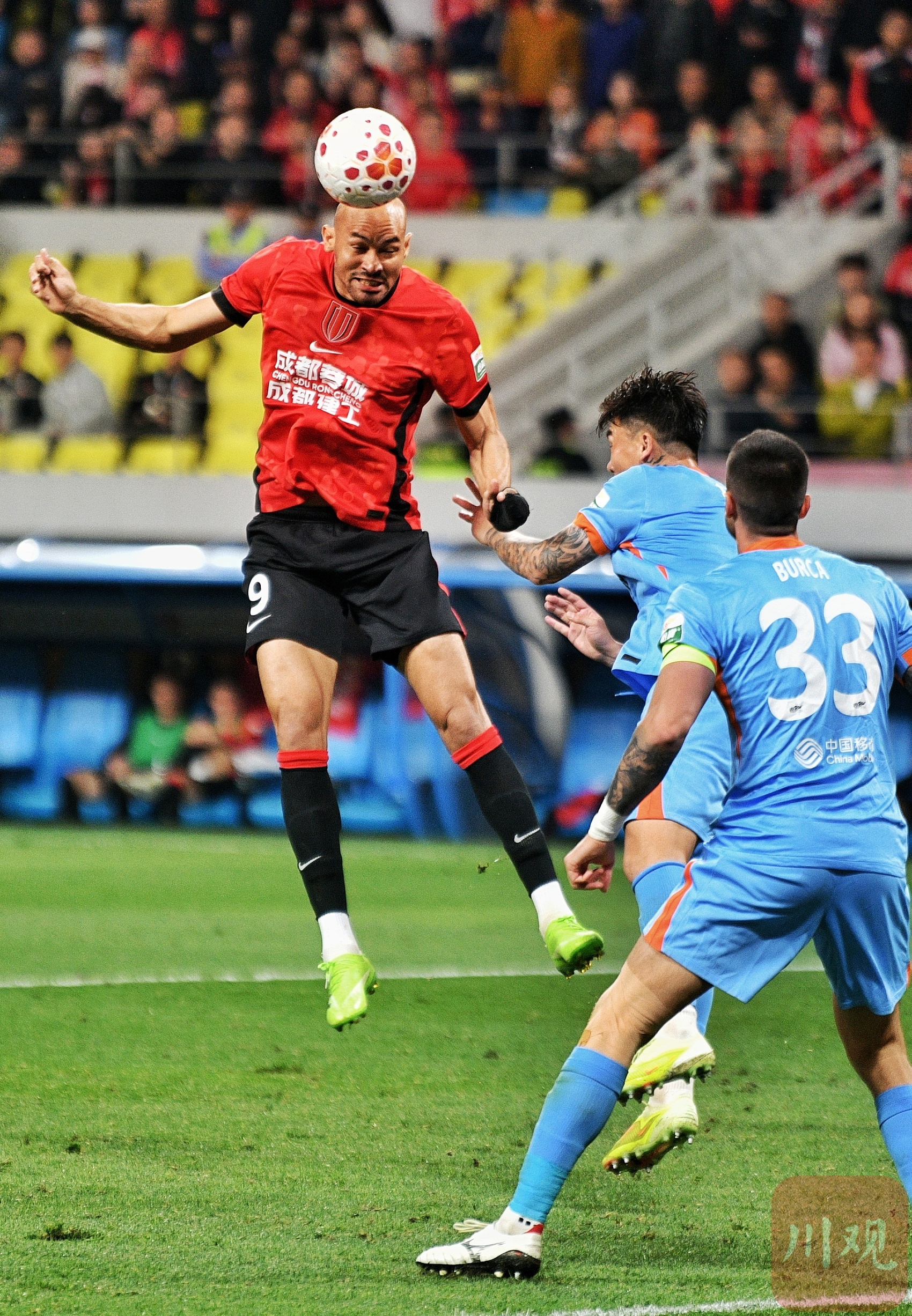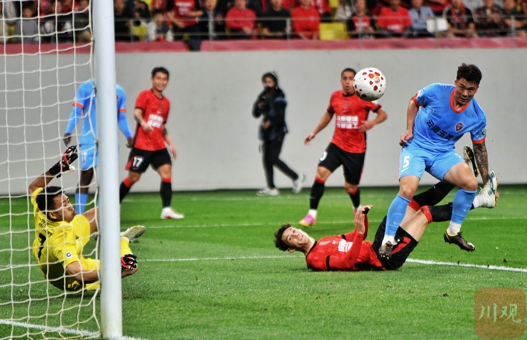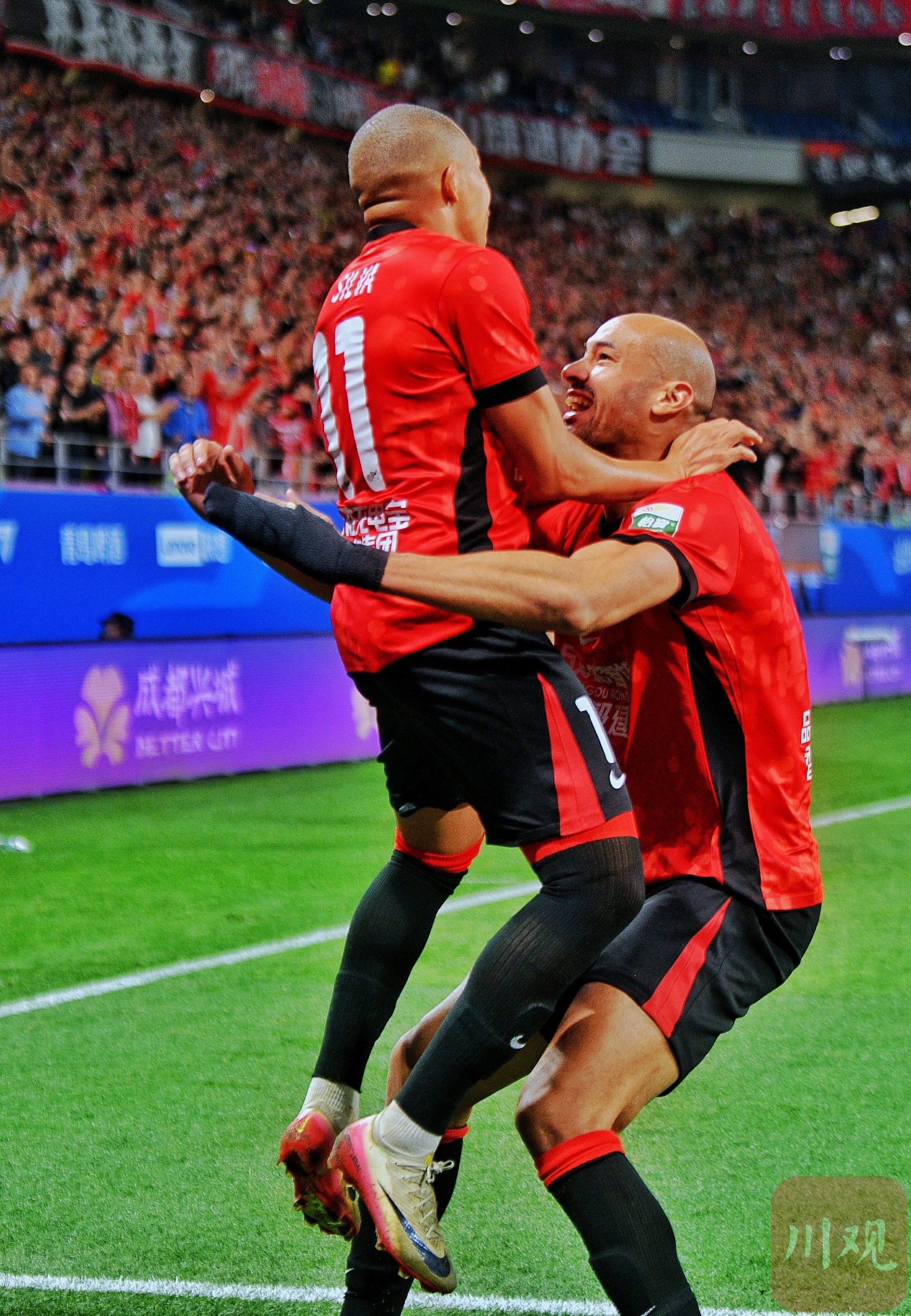 成都蓉城队员费利佩打入逆转一球瞬间。