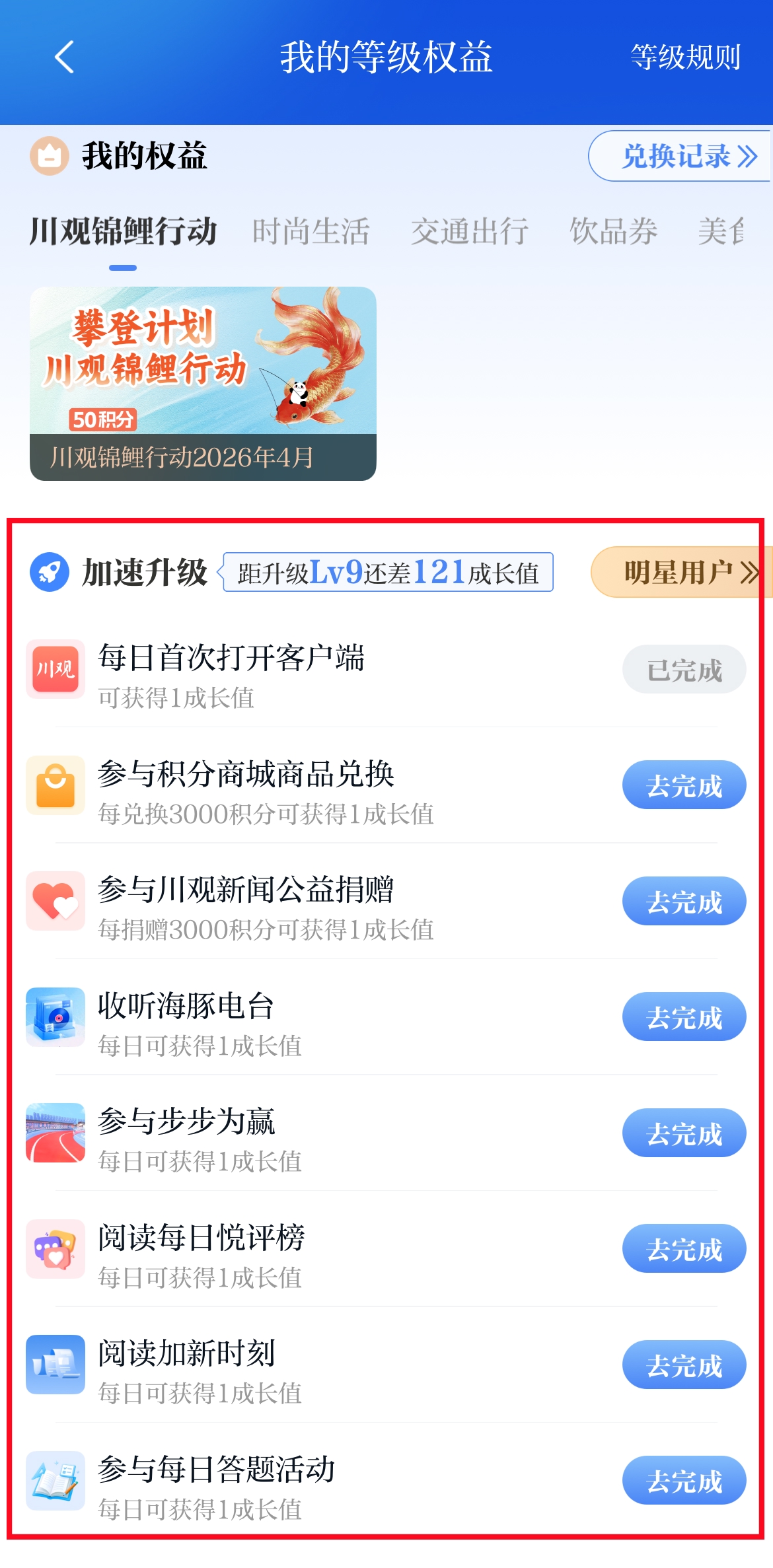 第四步:点击“去完成”,即可根据提示获取成长值。