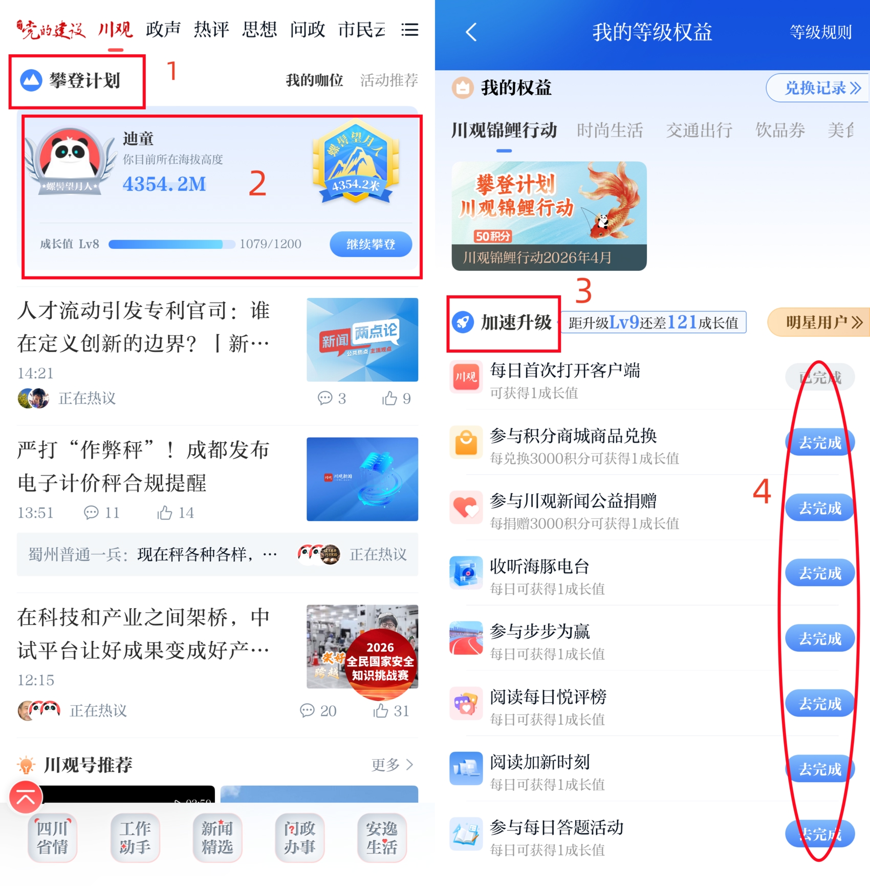 2.在川观新闻首页,点击“攀登计划”—“我的权益”,找到“川观锦鲤行动2026年4月”活动图片,根据提示参与抽奖。