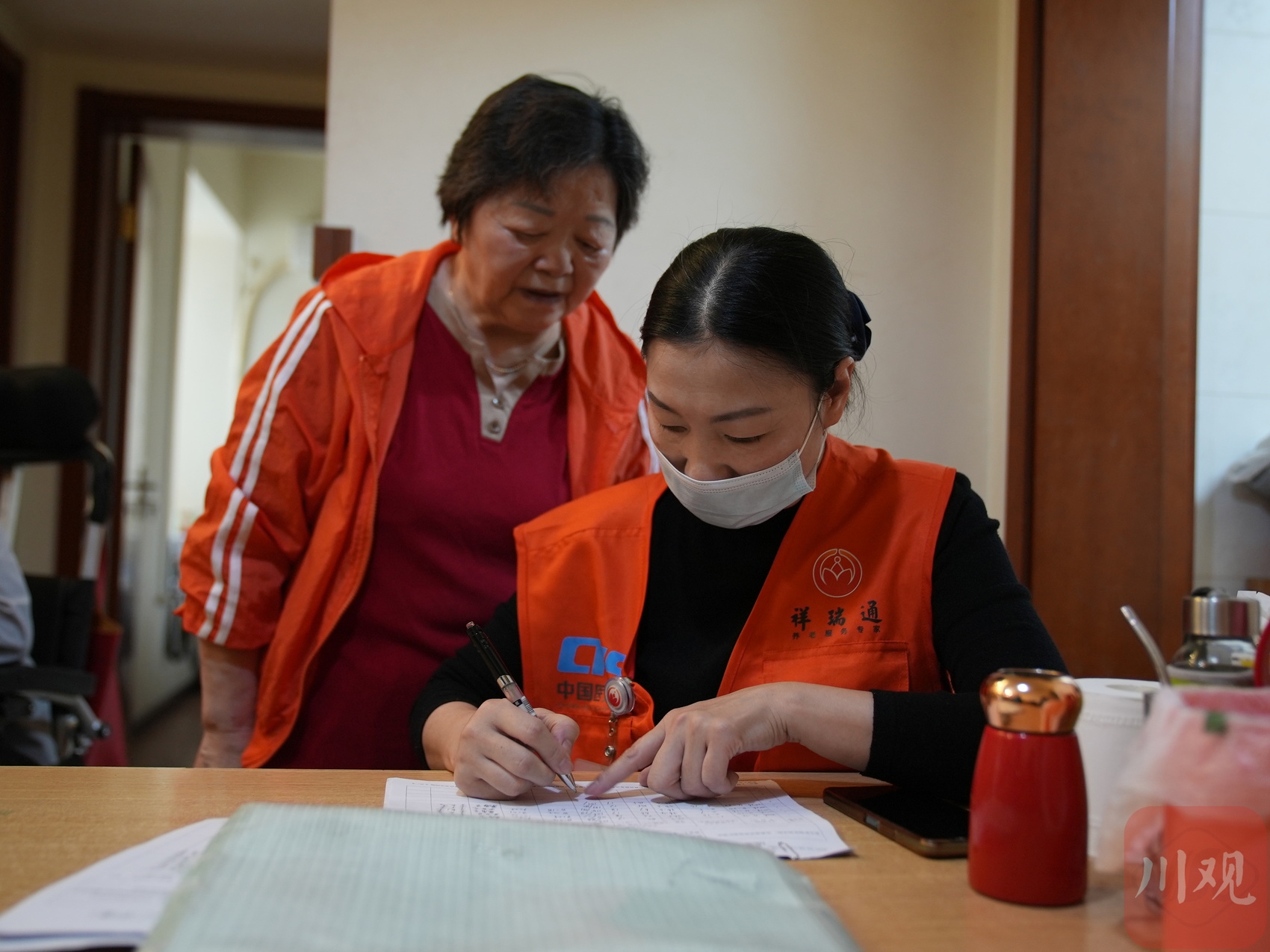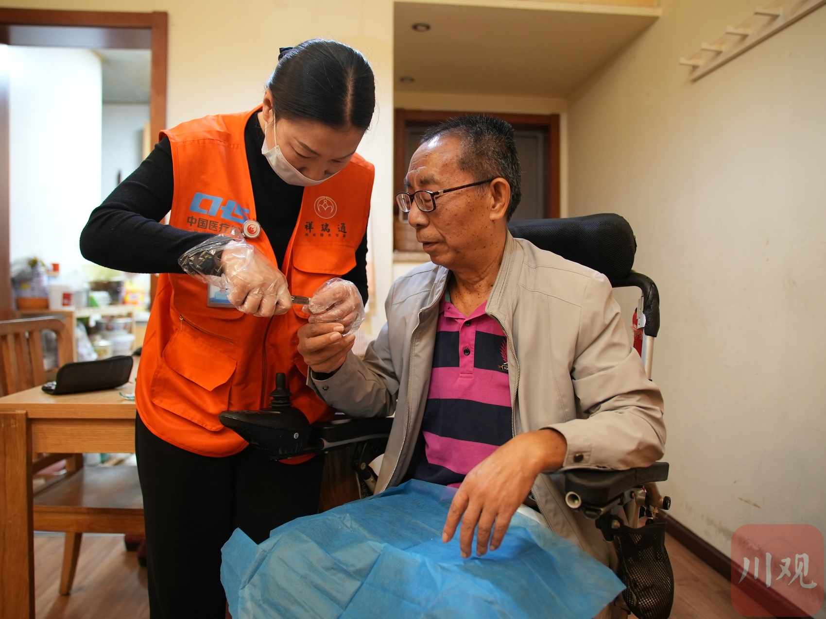 “罗哥,昨晚休息得好不好啊?我们今天主要做基础功能护理。”4月22日上午,成都成华祥瑞通护理站的养老护理员龚春容背着大大的护理包,熟门熟路地敲开74岁大爷罗先泽的家门。