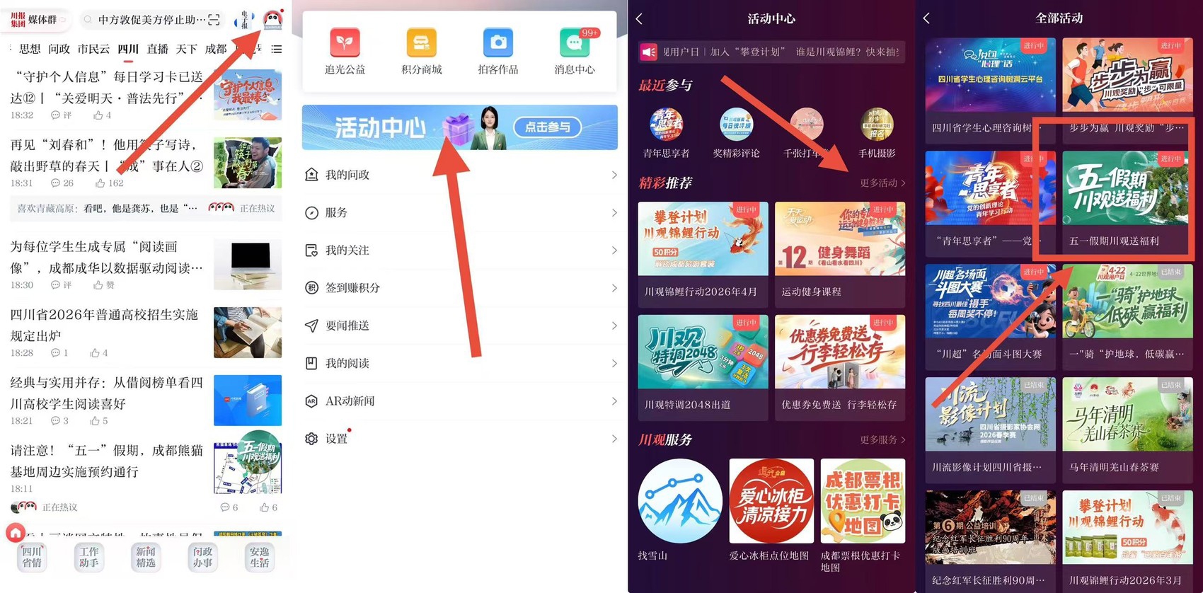 方式二:点击川观新闻客户端右上方个人头像,进入“活动中心”页面,找到“五一假期川观送福利”图片点击进入,消耗200积分参与刮刮卡抽奖。