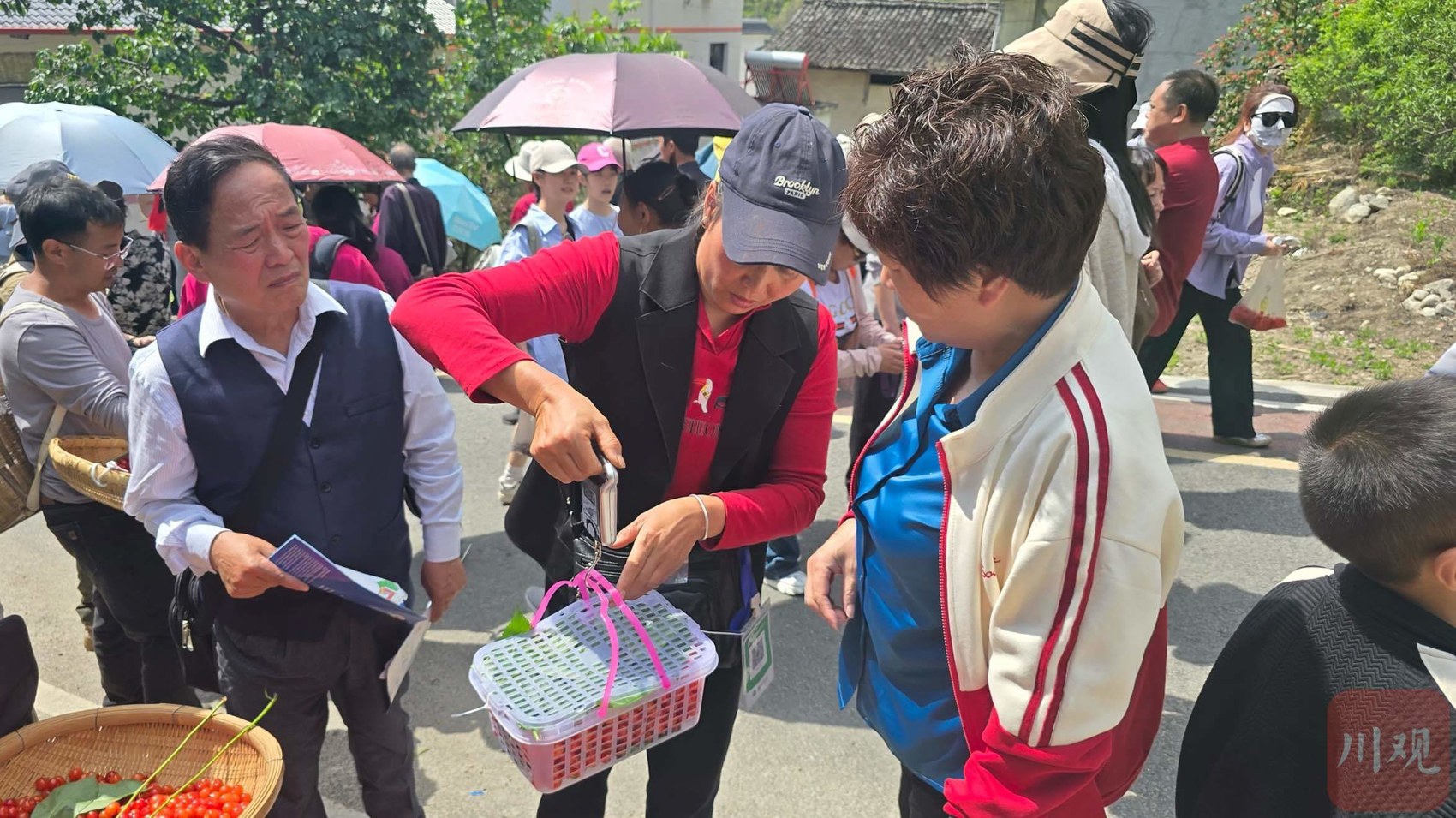刘万敏家的樱桃园就在赛道旁边。趁着游客多,她索性把摊位搬到了赛道起点的不远处。“新鲜采摘,先尝后买!”她一边吆喝,一边熟练地称重、打包。中午不到,她带来的一百多斤樱桃就所剩无几。