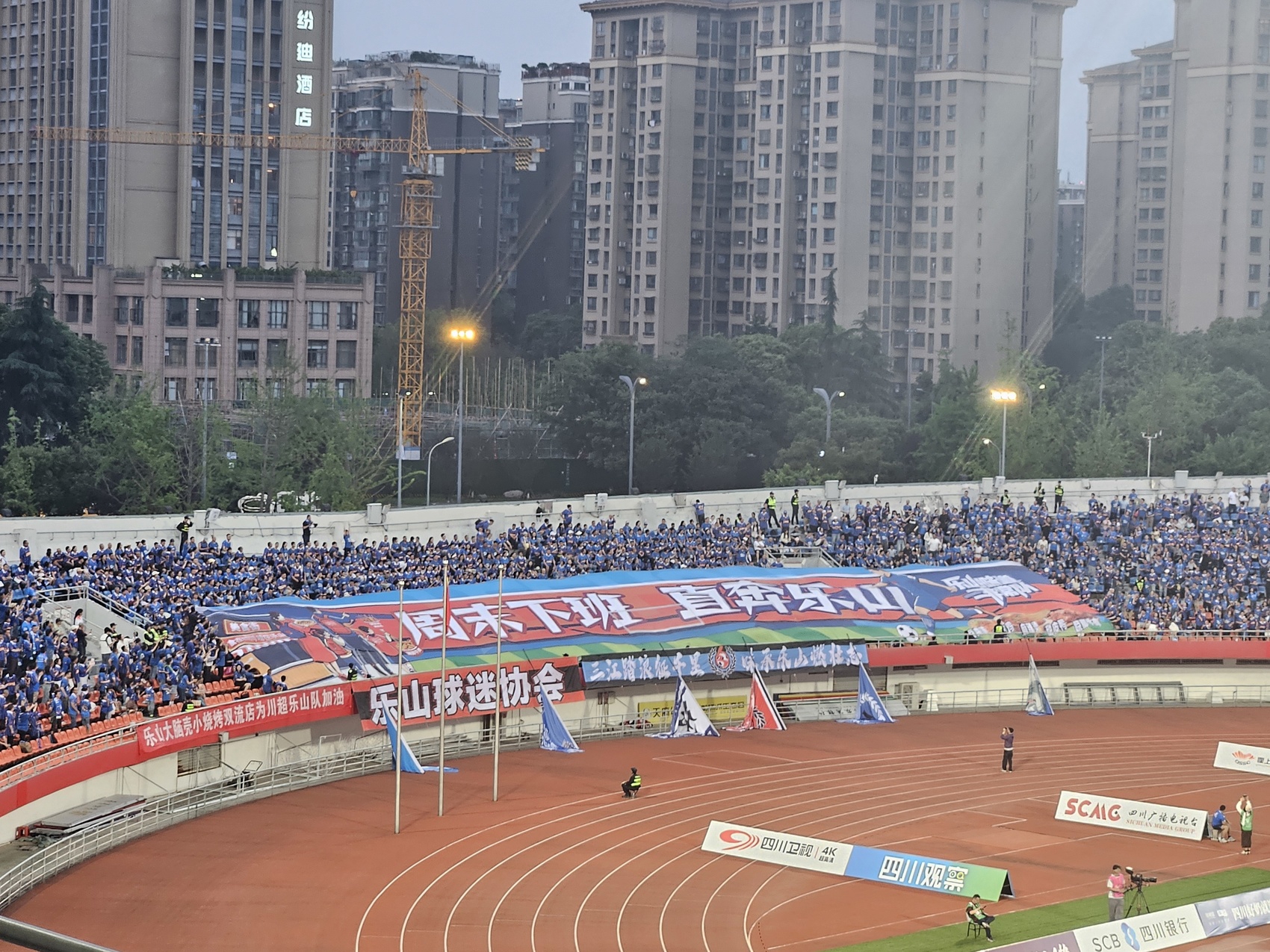 乐山球迷,打出“周末下班,直奔乐山”的巨型标语。