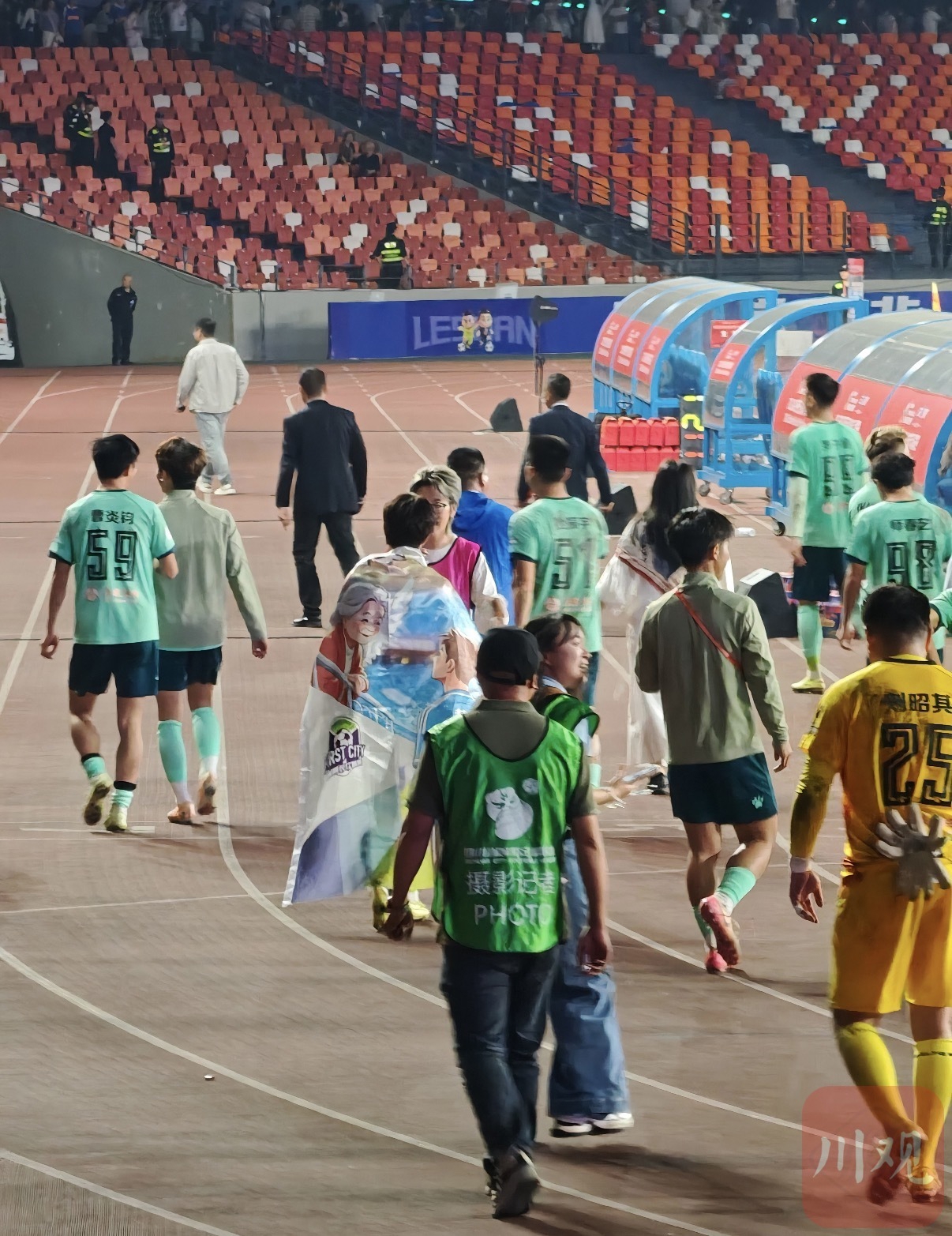 宜宾球迷的创意,背后有看得见的温度。为邹侑根设计门旗时,他们反复比对“全兴黄”的色号,因为那是四川足球三十年的血脉颜色。为廖连杰做旗,理由则十分简单,他的女友想让他知道,“看台上有人一直在看你”。为黄亮连夜赶制“爱从未离场”门旗,是因为他顶着奶奶去世的伤痛踢完了关键比赛,球迷想告诉他,奶奶与他同在。这些门旗的背后,是这座城市最朴素的待人之道:你为这座城市付出,这座城市便记得你。