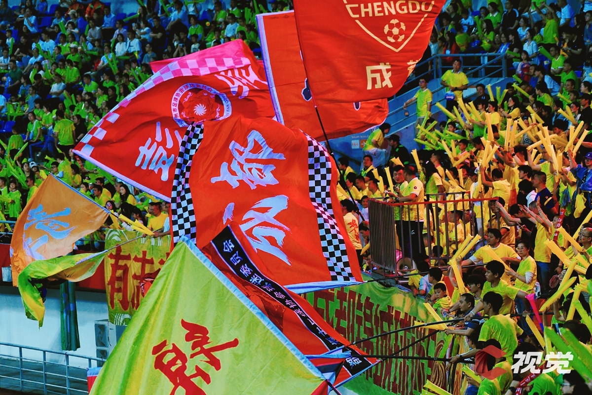 4月25日,成都锦城队主场2:1战胜乐山味道非常队。图为成都球迷主场助威。C视觉签约摄影师 向宇 摄