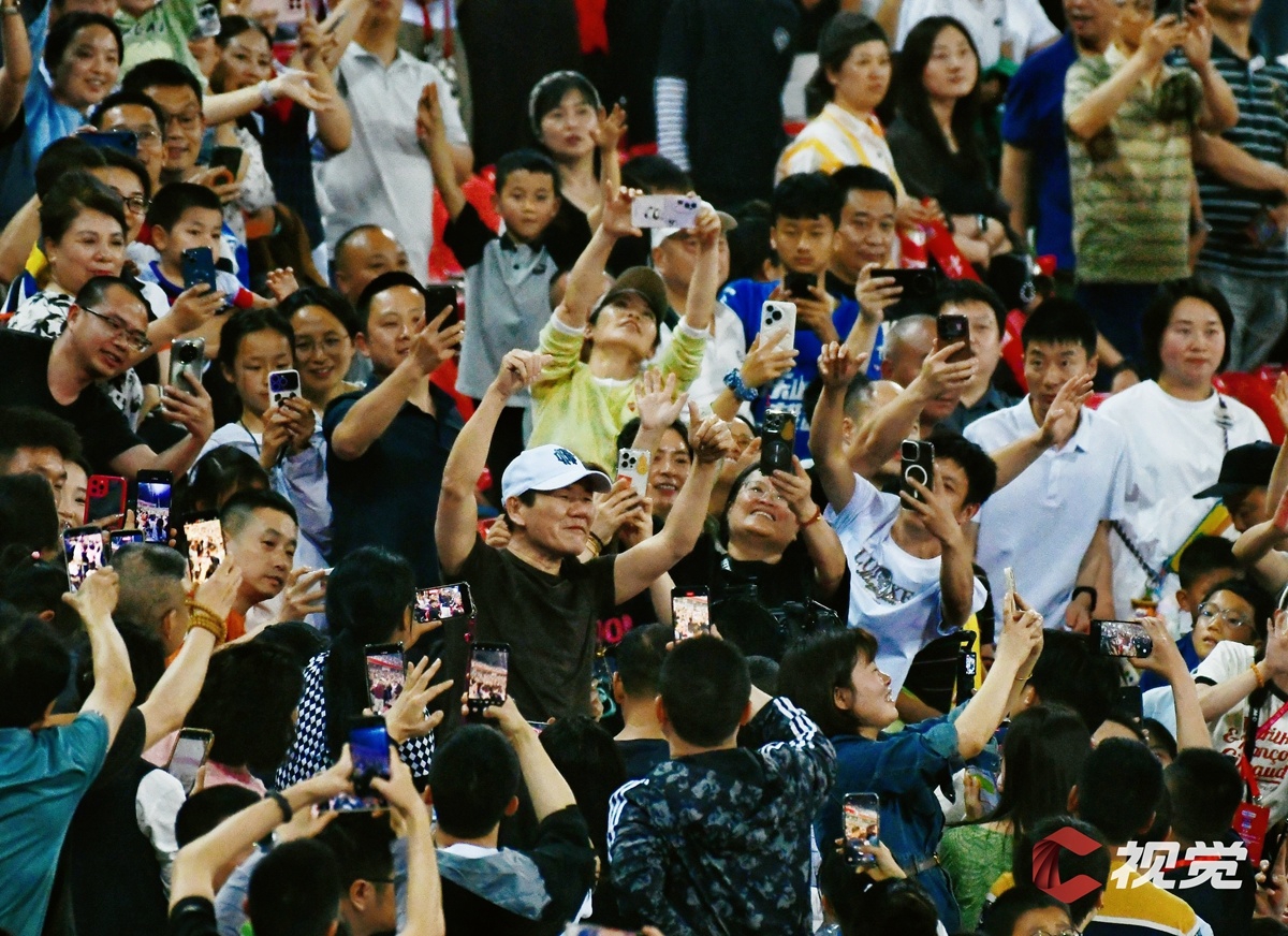 4月25日,成都锦城队主场迎战乐山味道非常队。图为歌手赵传现场观赛,为两队助威。C视觉签约摄影师 向宇 摄