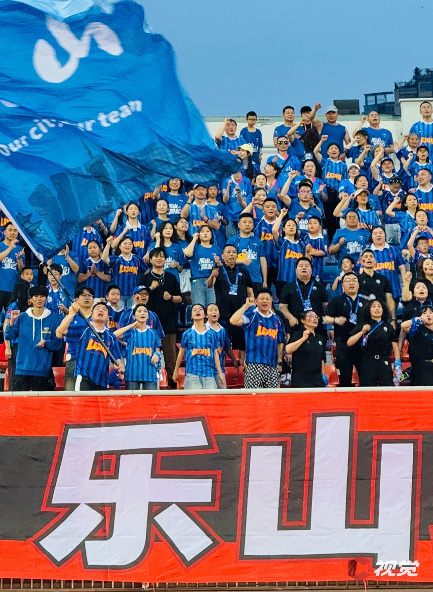 4月25日,成都锦城队主场迎战乐山味道非常队。图为看台上的乐山球迷齐呼口号为乐山队加油。C视觉签约摄影师 龚榜玉 摄