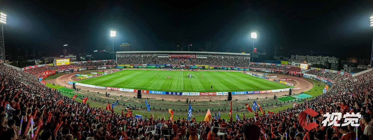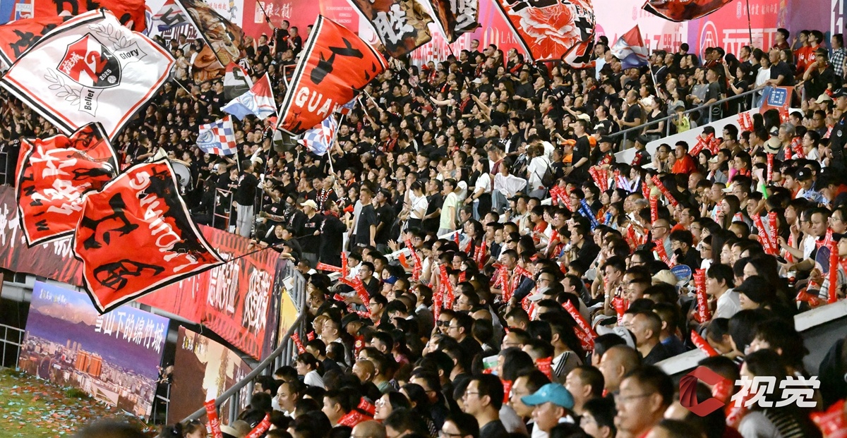 4月25日,自贡灯城燊龙队主场4:2战胜南充丝绸源点队。图为看台上的自贡球迷为主队加油助威。C视觉签约摄影师 崔玉平 摄